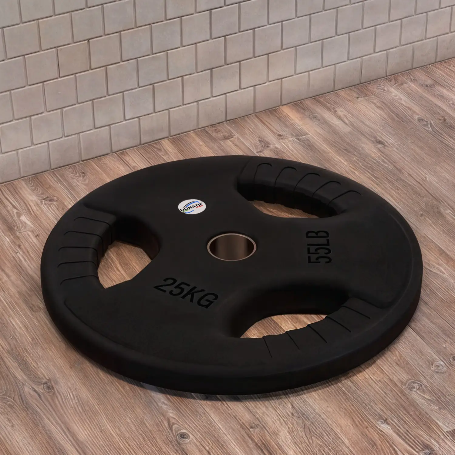 Die 25 kg schwere gummierte Hantelscheibe mit Griffen aus dem Donatif ist ein hochwertiges Produkt, ideal für jedes Fitnessstudio oder Home Gym. Es besteht aus Gusseisen und ist mit hochdichtem Gummi beschichtet, um eine höhere Haltbarkeit und Festigkeit zu gewährleisten. Diese Beschichtung schützt die Scheibe nicht nur vor Rost, sondern sorgt auch für eine deutliche Geräuschreduzierung während des Gebrauchs und einen optimalen Schutz des Bodens.