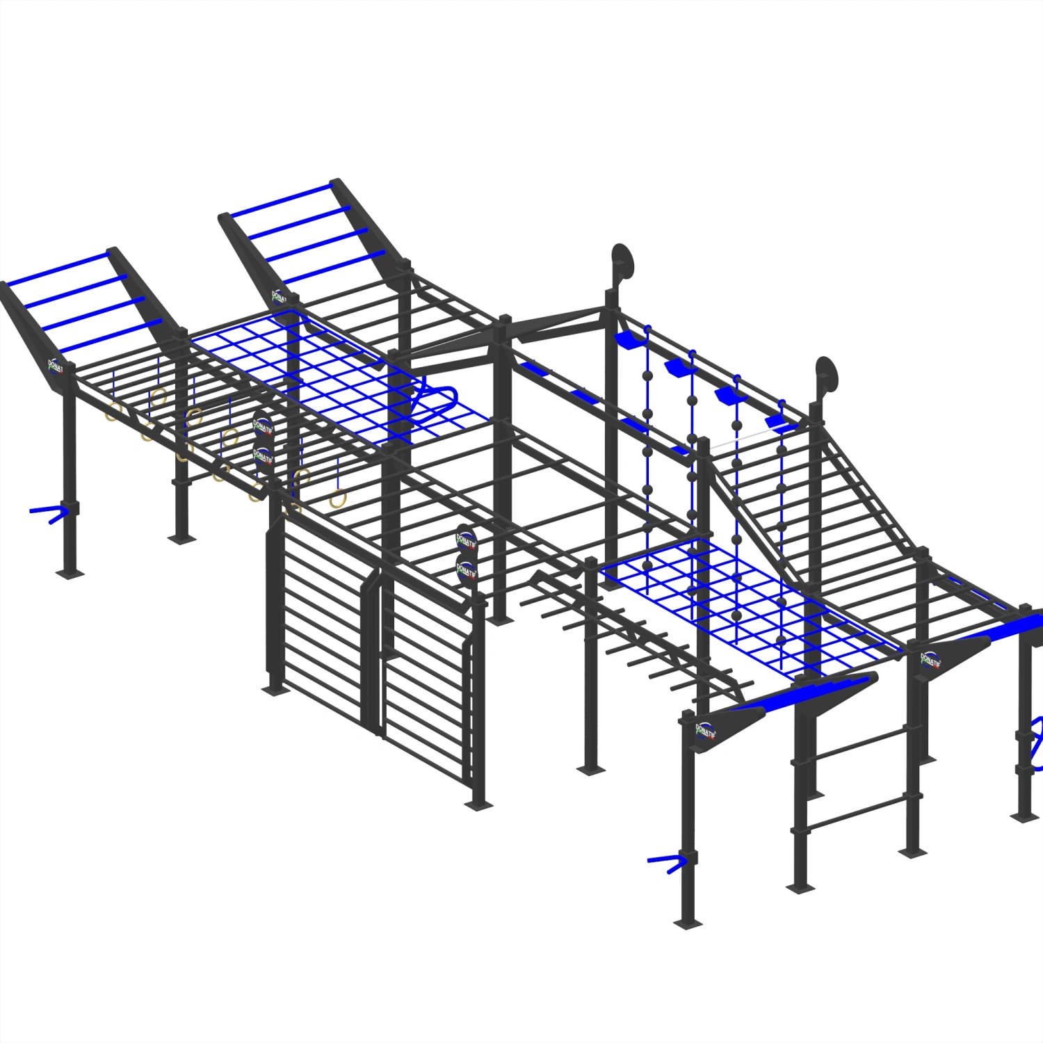 Bei dieser Einrichtung handelt es sich um einen umfassenden, mehrstufigen Parcours, der für das Hindernistraining im Ninja- und OCR-Stil konzipiert ist, mit einem Setup, das darauf ausgelegt ist, Kraft, Beweglichkeit, Koordination und Ausdauer zu testen. Das Rig verfügt über drei geneigte Rampen mit Klettergerüsten in auf- und absteigender Position, die sich perfekt für Übungen zum Schieben, Ziehen und Aufhängen der Mobilität eignen. Die Rampen führen zu Zwischenplattformen, die durch horizontale Stahlnetze verbunden sind und sich ideal zum Klettern im Freikörper oder für schwebende Vierbeiner eignen. Zwischen einem Modul und einem anderen sind verschiedene Abschnitte mit beweglichen Griffen, hängenden Schlaufen, Griffbällen, vertikalen Seilen mit Knoten und Zugringen integriert, Elemente, die Gleichgewicht, Technik und isometrische Festigkeit erfordern. Ein zentrales Merkmal der Struktur ist das Vorhandensein von vertikalen Seitengittern, die sowohl als Kletterwände als auch als Unterstützung für Übergangsübungen zwischen verschiedenen Stockwerken dienen. Einige Segmente sind mit mehreren horizontalen Stangen angereichert, ideal für explosive Klimmzüge, Schwungtechniken und Ausdauertests. Abgerundet wird der Weg durch Module mit vertikalen Zielen und Zubehörstützen, die für die Integration von Körpergewichtsübungen, Präzisionsstationen und kombinierter Arbeit mit Seilen oder Gummibändern (nicht im Lieferumfang enthalten) konzipiert sind. Die Symmetrie und Modularität machen diese Struktur perfekt anpassbar an Außenbereiche, für Einzelsitzungen oder Gruppentraining. Das Donatif Design vereint Funktionalität und Leistung in einer Einrichtung, die für OCR-Profis, fortgeschrittene Fitnesscenter und militärische Trainingslager geeignet ist. Jedes Element ist so konzipiert, dass es ein immersives und progressives Erlebnis schafft, das in der Lage ist, jeden Aspekt der körperlichen Vorbereitung zu stimulieren.