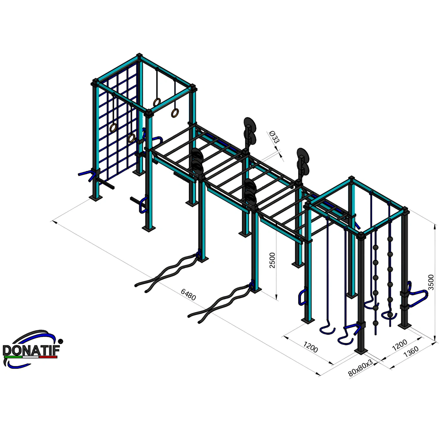 Geben Sie die gewünschten Anpassungen an und klicken Sie auf "Anpassung speichern".Die Calisthenics-Struktur mit LED-Technologie - CH28 ist eine professionelle Calisthenics-Struktur, die dank einer vollständig verstärkten Stahlkonstruktion eine hohe Leistung im Außenbereich bietet. Seine solide und imposante Architektur besteht aus 80x80x3 mm Vierkantrohren, die mit Feuerverzinkung behandelt wurden, um maximale Beständigkeit gegen Witterungseinflüsse zu gewährleisten, gefolgt von einer Pulverbeschichtung, die Haltbarkeit und ein hochwertiges Finish garantiert. Mit einer Tiefe von 648 cm, einer Breite von 136 cm und einer strukturellen Höhe von 350 cm präsentiert sich diese Lösung als komplette und robuste Plattform für das Bodyweight-Training. Das Gesamtgewicht der Struktur beträgt 500 kg, was auch bei starken Belastungen ein Synonym für Stabilität ist. Die 120 cm langen Klimmzugstangen mit einem Durchmesser von 33 mm sind so konzipiert, dass sie einen soliden und bequemen Griff bieten, der für jedes Sportlerniveau geeignet ist. Das Standarddesign umfasst eine schwarze, blaue und hellblaue Oberfläche, aber vollständig anpassbare Farben und Details sind auf Anfrage erhältlich. Die Elemente, aus denen sich diese Struktur zusammensetzt, bilden ein kompaktes, aber äußerst vielseitiges System, das für funktionelles Training, Konditionierung und Hindernistraining im OCR-Stil konzipiert ist. Die Konfiguration ist in drei Haupttürme unterteilt, die durch einen horizontalen Mittelteil verbunden sind und eine Vielzahl von Übungen in Bezug auf Federung, Traktion und Mobilität über mehrere Arbeitsetagen hinweg bieten. Die beiden Seitentürme verfügen über große vertikale Klettergitter und Netzwände, die sich ideal für Kletterübungen mit dem eigenen Körpergewicht und taktische Simulationen eignen. In ihnen sind vertikale Seile, aufgehängte Ringe und hängende Bälle integriert, die ein gezieltes Arbeiten an Kraft, Koordination und Griff ermöglichen. Der zentrale Teil der Struktur wird von einem System linearer Kletterstangen eingenommen, die von festen Griffen und vorderen Zielen flankiert werden und sich perfekt für Zugübungen, Schulterbeweglichkeit und sequentielle Passagen eignen. Unterhalb dieses Abschnitts finden die Battle Ropes stabile Verankerungen am Boden, die ein hochintensives Cardio-Training ermöglichen. Die gesamte Struktur ist von Stützen für Schhängeübungen und Zubehör durchzogen, die unendliche Möglichkeiten zur individuellen Gestaltung des Trainings bieten.