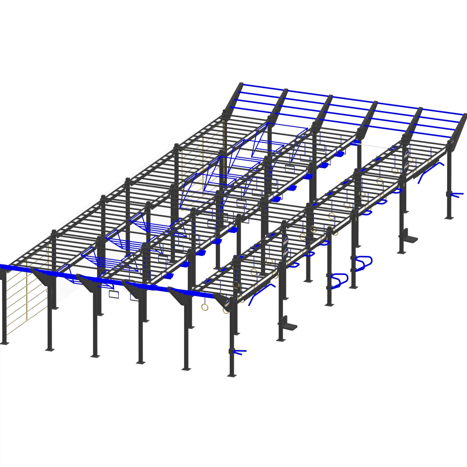 Bei dieser Struktur handelt es sich um eine modulare Hochleistungslösung, mit der ein vollständiger OCR-Pfad simuliert werden kann. Es besteht aus horizontalen, schrägen und gebogenen Klettergerüsten, Hängeringen, Kletterseilen, beweglichen Gurten, Übergangsplattformen, Steigbügelpassagen, vertikalen Leitern und einer langen Kletterwand mit bunten Griffen. Die Module sind auf mehreren parallelen Lanes organisiert, so dass mehrere Benutzer gleichzeitig geschult werden können.