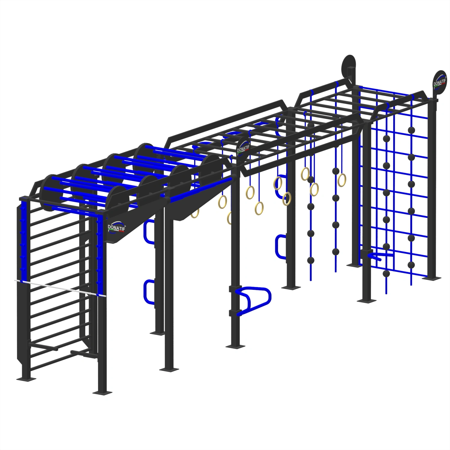 Bei dieser Struktur handelt es sich um ein kompaktes und komplettes Multi-Rig, das sich ideal für das Hindernistraining im Ninja- und OCR-Stil eignet. Es besteht aus einem vertikalen Gitter zum Klettern, Seilen mit Knoten zum Freikörperklettern, einem langen Abschnitt mit Klettergerüsten und Aufhängeringen für Zug-, Schaukel- und Koordinationsübungen. In der Mitte befinden sich rotierende Scheiben und geneigte Stangen, die den Griff, das Gleichgewicht und die Kontrolle verbessern sollen. Abgerundet wird der Weg durch Rampen mit Stangen, bewegliche Griffe und Module mit vertikalen Sprossen für fortgeschrittene technische Bewegungen. Diese robuste, vielseitige und modulare Donatif Anlage eignet sich perfekt für OCR-Parks, spezialisierte Fitnessstudios und funktionelle Trainingslager.