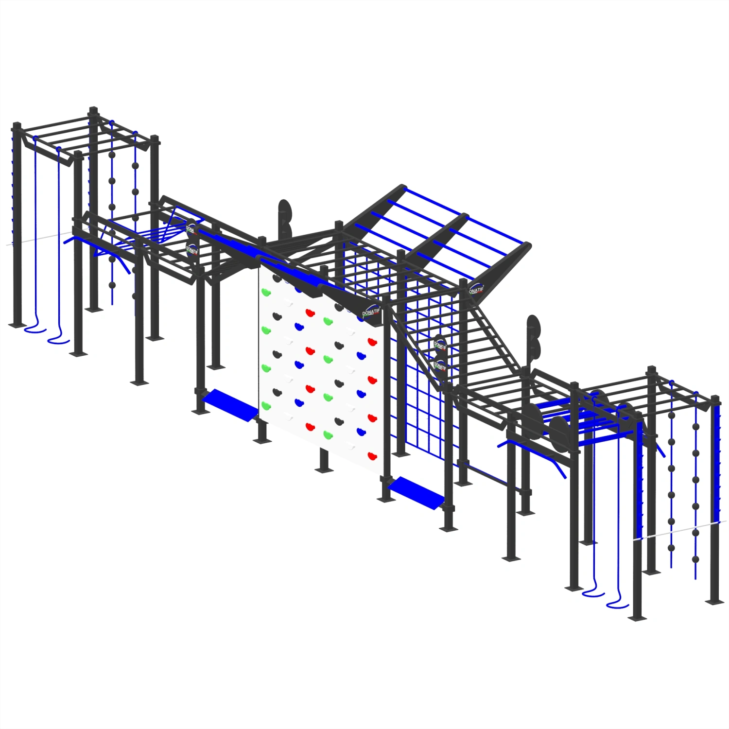 Diese Struktur für das Hindernis- und Ninja-Training setzt sich aus einer Kombination von hochfunktionalen Elementen zusammen. Es beinhaltet Kletterseile, hängende Entergreifbälle, horizontale und geneigte Klettergerüste, vertikale Klettergitter aus Stahl, eine schräge Rampe mit bergauf führenden Klimmzugstangen und eine spektakuläre vertikale Wand mit bunten Griffen. Abgerundet wird das System durch Module mit rotierenden Scheiben, aufgehängten Ringen, niedrigen Plattformen, vertikalen Polen und seitlichen Stützen für Schwingungen und Übergänge.