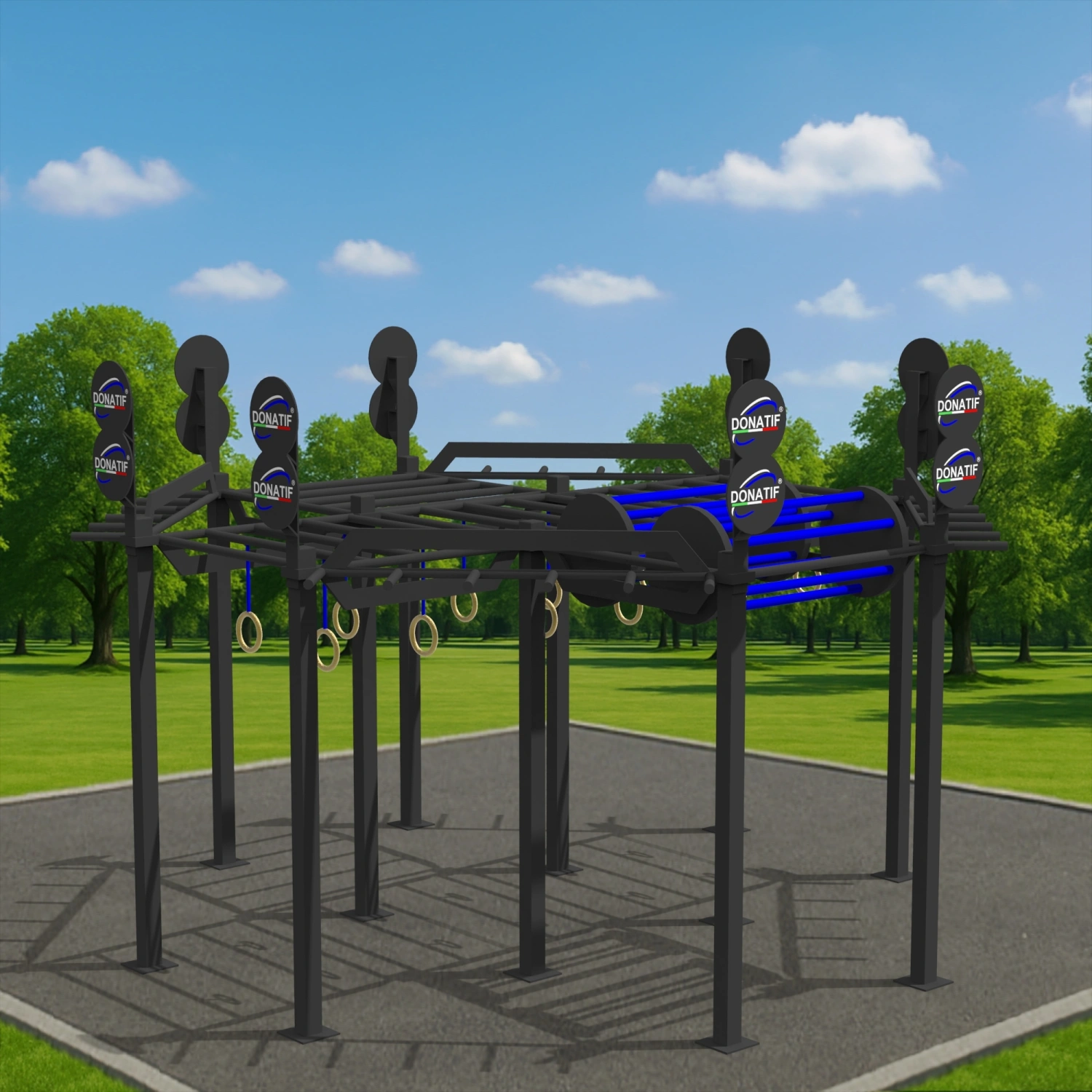 Die Calisthenics-Struktur mit Ringen - CH40 wurde entwickelt, um eine Kombination von Funktionskomponenten zu integrieren, die in der Lage sind, ein breites Spektrum an Übungen abzudecken. Klettergerüste und horizontale Querstangen ermöglichen Feder-, Zug- und Ausdauertrainings, die bei Calisthenics und OCR-Vorbereitung unerlässlich sind. Die hängenden Ringe sind das Herzstück der Struktur: vielseitige Werkzeuge, die es Ihnen ermöglichen, Koordination, Explosivkraft, Rumpfstabilität und fortgeschrittene Bewegungen wie Dips und Muscle-Ups zu entwickeln. Die multifunktionalen Seitenstangen ermöglichen Schiebe- und Zugübungen in verschiedenen Variationen, während die rotierenden Rollen und speziellen Griffe den Griff und die Ausdauer stärken und so Hindernisse simulieren, die für Wettkämpfe wie Spartan Race oder Ninja Warrior typisch sind.