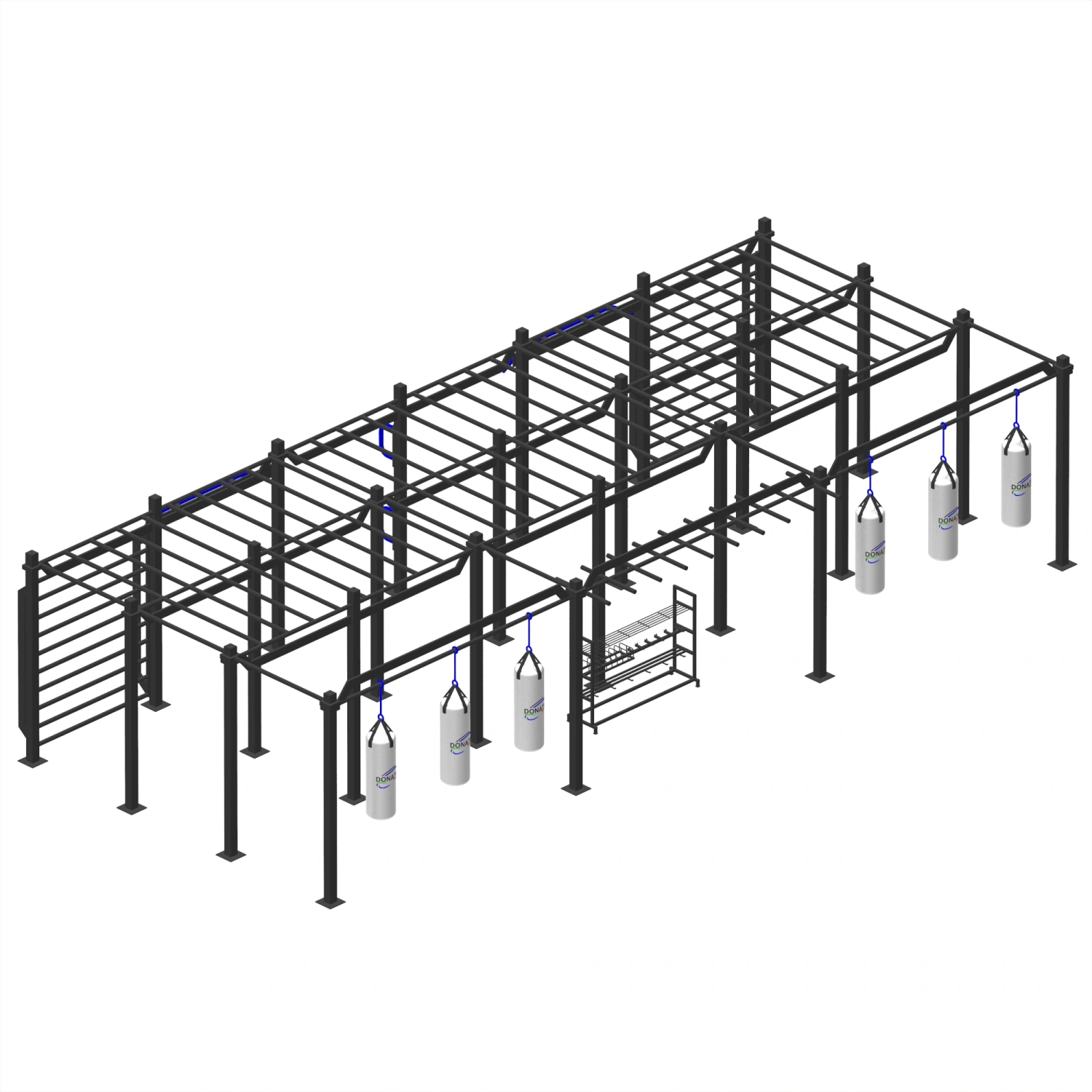 Diese multifunktionale Struktur wurde entwickelt, um funktionelles Training, athletisches Training und Kampfdisziplinen in einer einzigen Struktur zu vereinen. Er verfügt über eine doppelte Bahn aus Klettergerüsten für Suspensionsübungen und Klimmzüge sowie mehrere hängende Boxsäcke für Cardio- und technische Arbeiten. An den Seiten befinden sich vertikale Leitern und Sprossen wie eine schwedische Leiter für Kletter- und Kraftübungen, während die parallelen Griffe Dips und Freikörperbewegungen ermöglichen. In der Mitte ist ein Werkzeugraster-Modul integriert, um den Bereich aufgeräumt und funktional zu halten. Abgerundet wird die Struktur durch Stangen für mehrere Klimmzüge, ideal für vielseitige und Gruppentrainings. Kompakt, technisch und komplett: perfekt für Fitnessstudios und Zentren mit hoher Intensität.