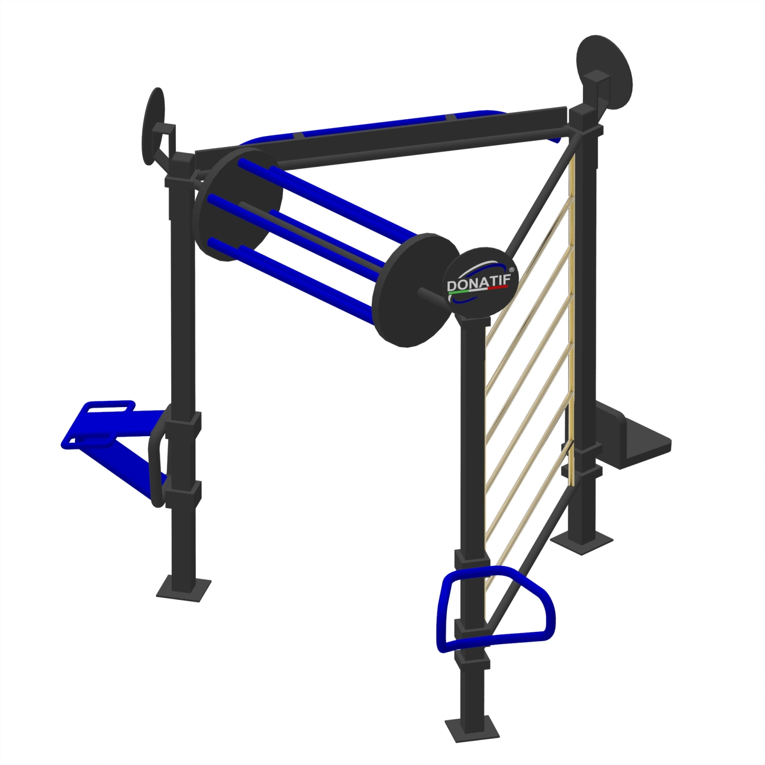 Diese dreieckige Calisthenics-Struktur - CH59 eignet sich perfekt für die Installation in Fitnessparks, öffentlichen Bereichen, Sportzentren, Badeanstalten oder Wellness-Räumen für Unternehmen und verwandelt selbst kleine Flächen in komplette Bereiche für körperliche Aktivität. Seine Konfiguration ermöglicht es Ihnen, Calisthenics, funktionelles Training, OCR-Übungen und hochintensive Zirkel zu üben. Horizontale Stangen ermöglichen dynamische Klimmzüge, Suspensionen und Klimmzüge; Die Sprossenwand unterstützt Beweglichkeit, Beweglichkeit und funktionelle Kraftübungen; Die Griffrollen stimulieren Koordination und Ausdauer; während Dip-Stangen und Griffe der Stärkung von Trizeps, Brustmuskeln und Kernen dienen. Dank seines kompakten Layouts kann er von bis zu 5 Personen gleichzeitig genutzt werden und bietet eine Kombination aus individuellem und kollektivem Arbeiten.