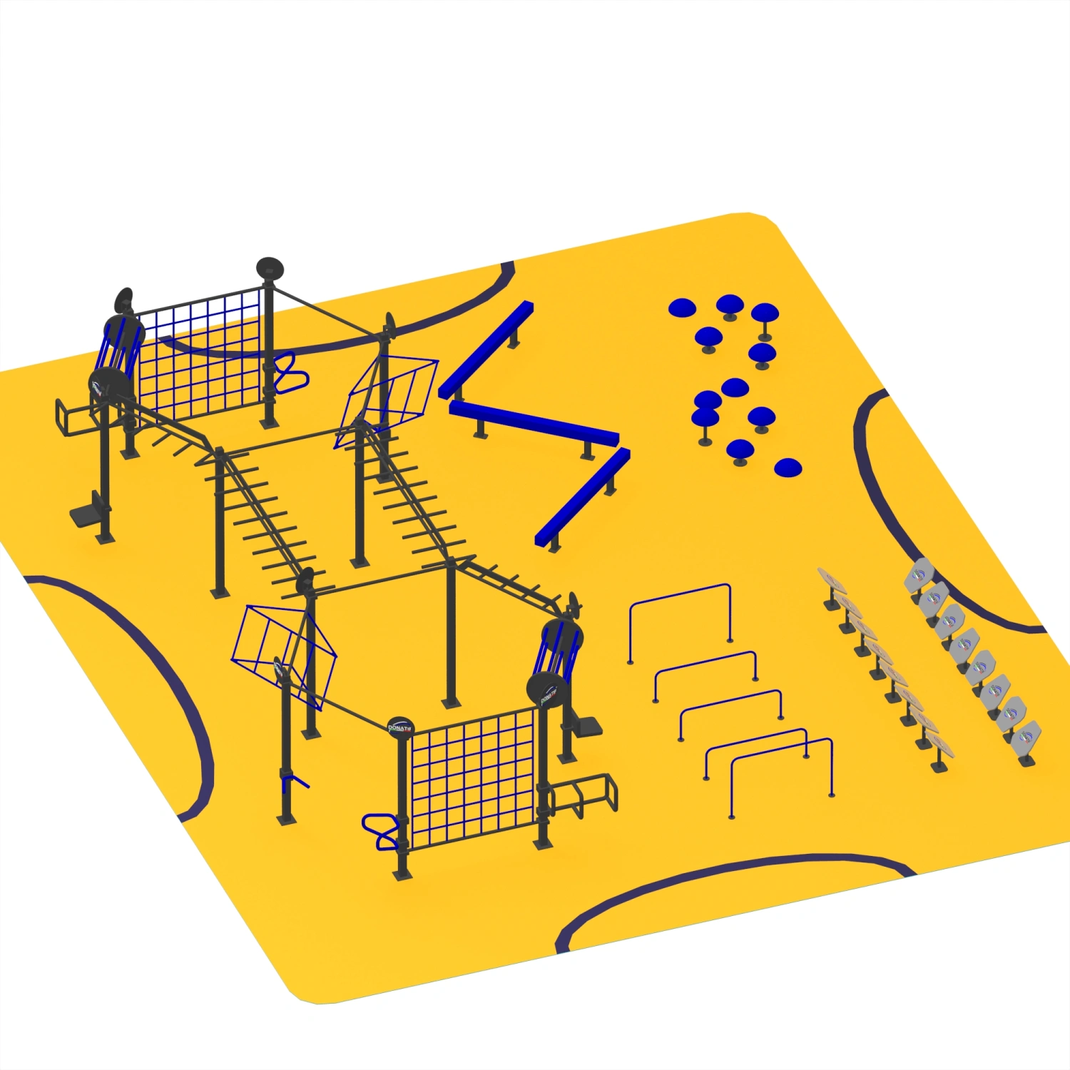 Zu den Komponenten gehören verlängerte Kletterstangen, vertikale Kletternetze, geneigte und geformte Module, Gymnastikringe, Parallelstangen, niedrige Hindernisse, mehrere Stufenpods und Gleichgewichtsbänke, mit denen Sie Klimmzüge, Klettern, plyometrische Sprünge, dynamische Pfade und Aufhängeübungen ausführen können. Alle Elemente sind so konzipiert, dass sie abwechslungsreiche, vollständige und hochintensive Workouts bieten. Der CH73 passt sich an Kontexte wie städtische Parks, Sportzentren, Schulen und Kasernen an und wird zu einem idealen Werkzeug für die Entwicklung von Kraft, Ausdauer, Koordination und Wettbewerbsgeist. Eine Struktur, die Leistung, Spaß und Aggregation vereint und jedes Workout in ein einzigartiges Erlebnis verwandelt.