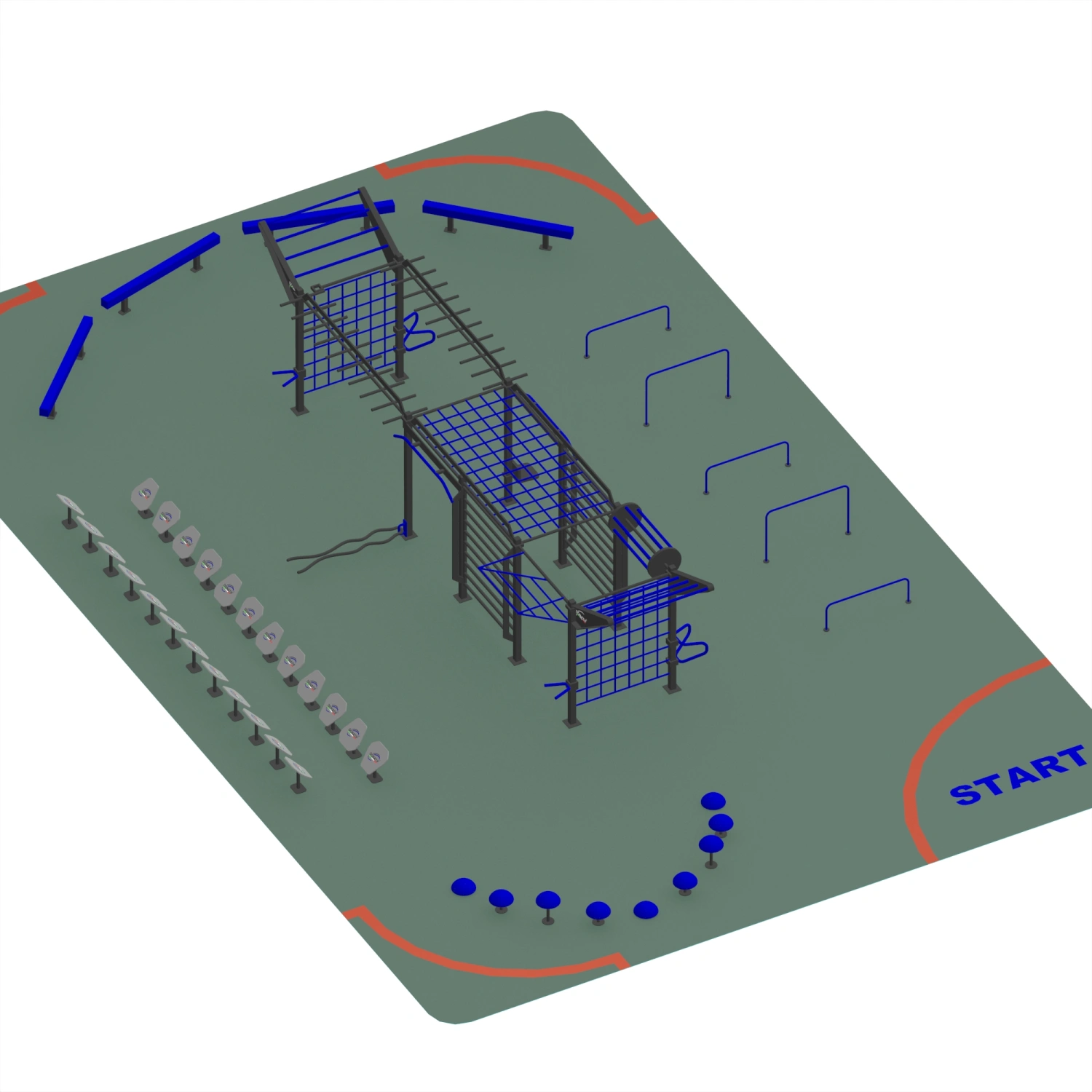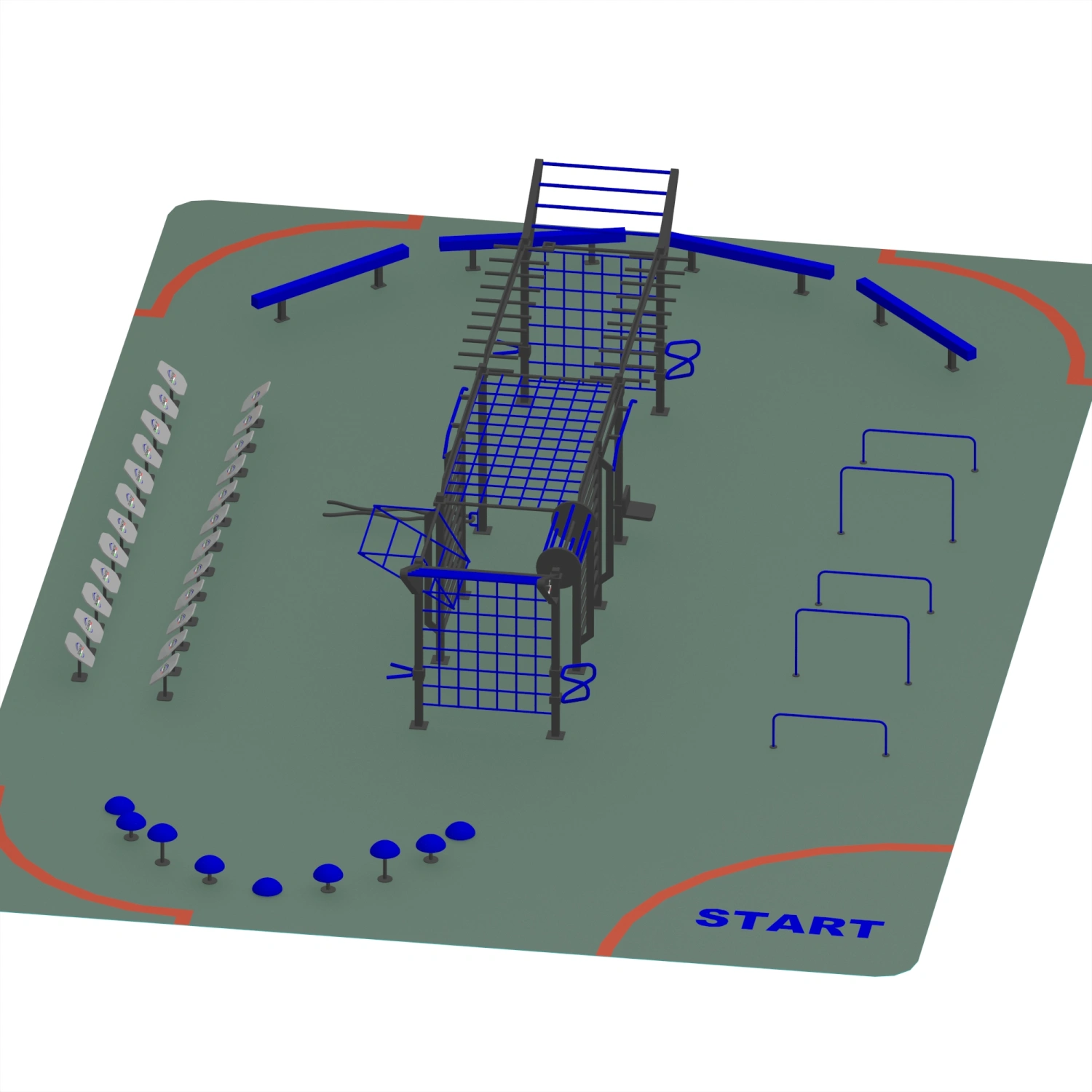 Die Low and High Parallel Bar Structure - CH74 ist als kompletter OCR-Kurs konzipiert, der Calisthenics, Functional Training und Hindernistraining kombiniert. Die Struktur umfasst verlängerte Kletterstangen für dynamische Klimmzüge und verlängerte Aufhängungen, vertikale Kletternetze für Kraft- und Beweglichkeitsübungen, schräge Rampen für Ausdauer- und Koordinationstests, Gymnastikringe für Stabilitäts- und Kontrollübungen, Parallelstangen für die Entwicklung der Brust-, Trizeps- und Rumpfmuskulatur sowie Gleichgewichtsbänke und Mehrstufenpods Ideal für Beweglichkeitsübungen, plyometrische Sprünge und Stabilisationsübungen. Dank dieser Vielzahl von Stationen ist es möglich, ein Training durchzuführen, das auf alle motorischen Fähigkeiten abzielt: Kraft, Schnelligkeit, Ausdauer, Beweglichkeit und Gleichgewicht. Die Struktur ist für die Installation in städtischen Parks, Sportzentren, Schulen, Kasernen, Universitäten und speziellen OCR-Bereichen konzipiert und wird zu einem Bezugspunkt für Einzeltraining, Gruppensitzungen und sportliche Weiterbildungsaktivitäten.