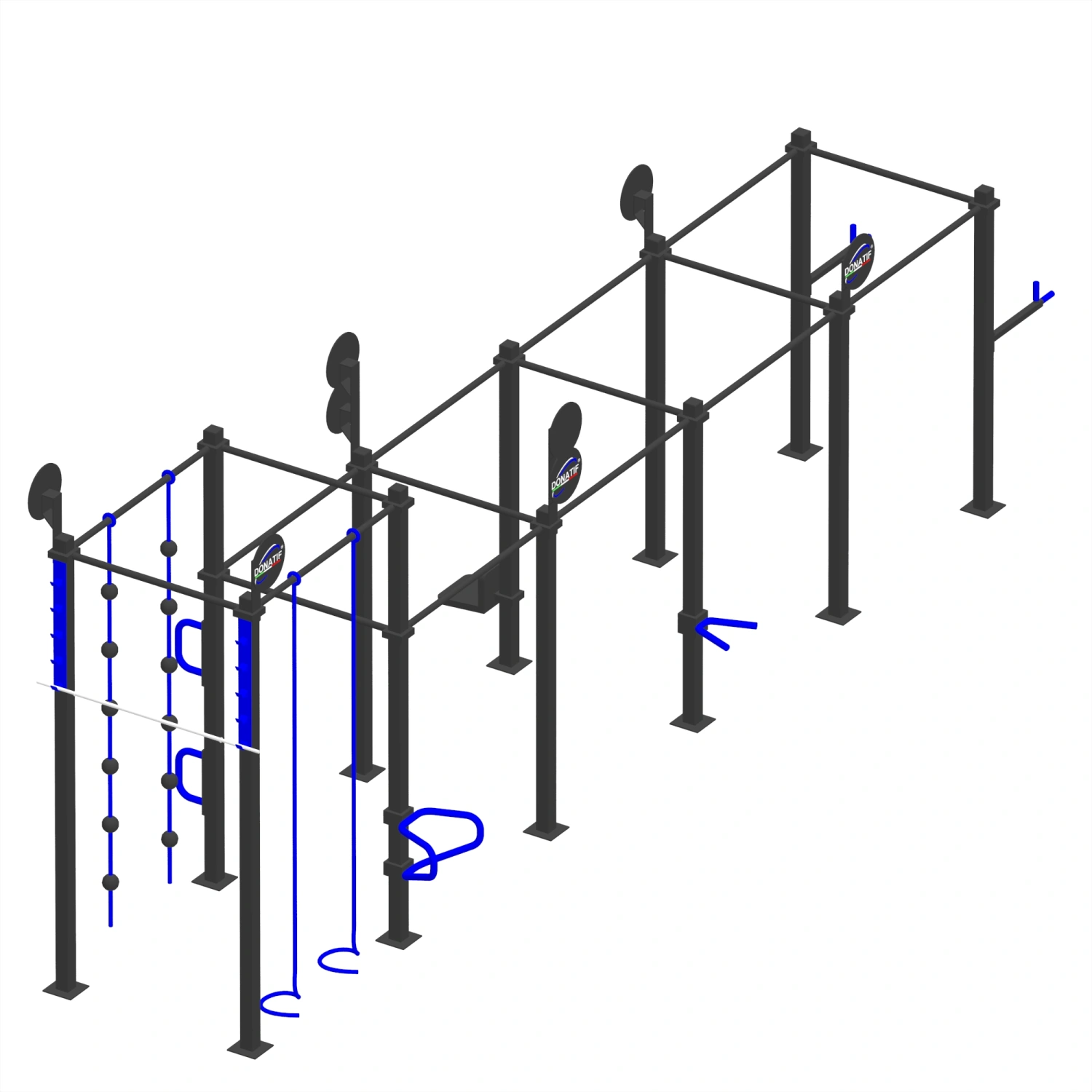 Diese Multi-Rig-Struktur für Cross Fitness vereint mehrere Funktionsstationen, die für das komplette Kraft-, Koordinations- und Ausdauertraining konzipiert sind, in einem einzigen System. Über die gesamte Länge befinden sich durchgehende horizontale Stangen, die sich ideal für Klimmzüge, Schaukeln und Hängearbeiten eignen. Es gibt hängende Ringe, vertikale Seile und Kanonenkugeln, die dynamische und technische Übungen ermöglichen, die für OCR- und Ninja-Training unerlässlich sind. Ebenfalls in die Struktur integriert sind parallele Griffe für Dips, eine Station für Bauchmuskeln und Stationen mit Haken für Gummibänder oder Langhanteln. An den zu treffenden Seitenpfosten sind mehrere vertikale Ziele installiert, die sich perfekt für explosive Übungen oder Präzisionstests eignen. Der modulare Aufbau und die Vielfalt der Elemente machen diese Struktur ideal für das Einzel- oder Gruppentraining, sowohl im Fitness- als auch im Leistungssportbereich.