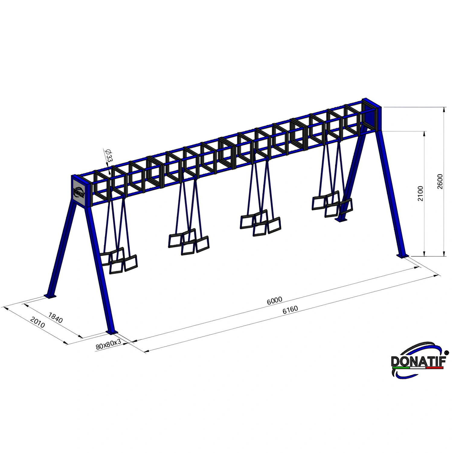 Geben Sie die gewünschten Anpassungen an und klicken Sie auf "Anpassung speichern".Diese Calisthenics Cross-Trainingsstruktur - CH47 besteht aus hochfestem Stahl mit einem Vierkantrohr von 80x80x3 mm, das auch bei intensiver Nutzung Stabilität und lange Lebensdauer garantiert. Jedes Bauteil wird durch eine doppelte Behandlung geschützt: Feuerverzinkung, um Korrosion entgegenzuwirken, und Pulverbeschichtung für ein elegantes und witterungsbeständiges Finish. Die Grundfarbe ist in Schwarz und Blau erhältlich, mit der Möglichkeit der Anpassung, um sich an verschiedene Kontexte anzupassen.
