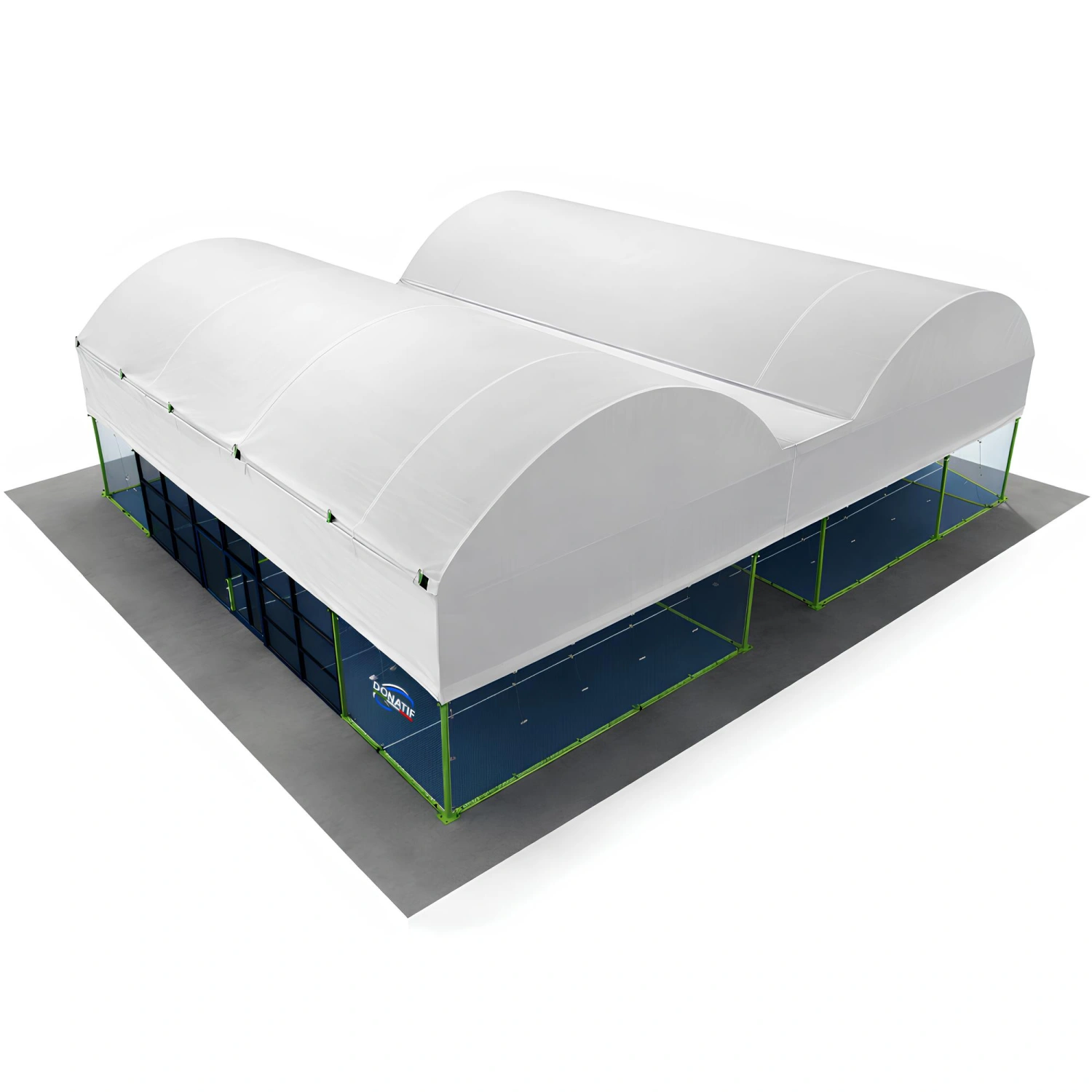 Der überdachte Doppel-Padelplatz CP75 stellt eine fortschrittliche und hochprofessionelle Lösung für Sportanlagen dar, die ein Maximum an Platz, Leistung und Spielkomfort bieten wollen. Dieses System besteht aus der Kombination von zwei Panoramaplätzen des Modells CP5, die in ein einziges überdachtes Zelt integriert sind. Es bietet Schutz auch in zentralen Übergangsbereichen und bietet Kontinuität und Funktionalität ohne Kompromisse.