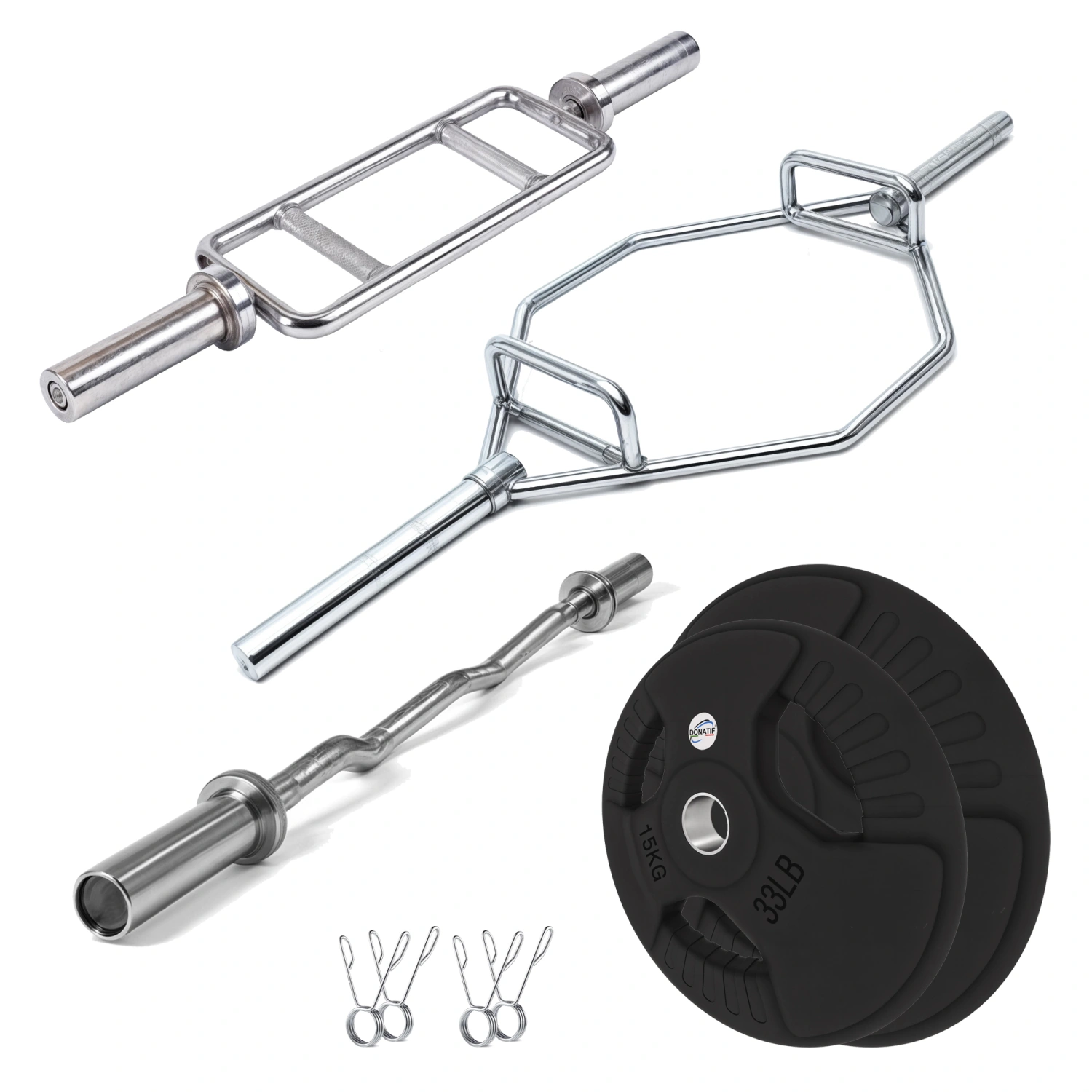 Das olympische Langhantelset mit 70 kg gummierten Scheiben ist äußerst vielseitig und kann für eine Vielzahl von Übungen verwendet werden, an denen alle wichtigen Muskelgruppen beteiligt sind. Die EZ-Langhantel ist ideal für Übungen, die einen abgewinkelten Griff erfordern, wie z. B. Bizepscurls oder Trizepsstreckungen, wodurch die Belastung der Handgelenke und Ellbogen reduziert wird. Die Trizepsstange eignet sich perfekt, um sich mit Übungen wie der French Press auf diese spezielle Muskelgruppe zu konzentrieren.