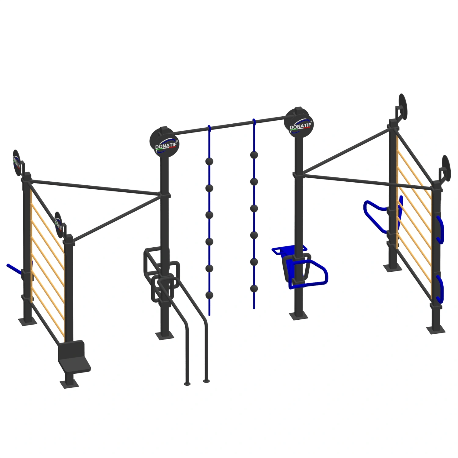 Geben Sie die gewünschten Anpassungen an und klicken Sie auf "Anpassung speichern".Die Double Wall Bars Structure - CH65 DONATIF ist eine Outdoor-Station, die für komplette und multidisziplinäre Workouts konzipiert wurde. Hergestellt aus hochfestem Stahl mit Vierkantrohr 80x80x3 mm, vereint es Solidität und Langlebigkeit. Die Feuerverzinkung und Pulverbeschichtung macht es widerstandsfähig gegen Witterungseinflüsse und bewahrt Funktionalität und Ästhetik auch im Außenbereich. Mit Abmessungen von 584 cm Tiefe, 305 cm Breite und 350 cm Höhe und einem Gesamtgewicht von 230 kg bietet er Stabilität und Zuverlässigkeit. Zu seinen Elementen gehören: vertikale Sprossenwand zum Klettern, Dehnen und Bewegen, Parallelstangen für Dips und Push-Training, Seile mit Kletterbällen zur Verbesserung von Grip und Widerstand, Zugstangen (120 cm, Durchmesser 33 mm) für Calisthenics- und Functional Training Übungen sowie Stützmodule für Übungen, die auf den Rumpf und die oberen Gliedmaßen abzielen.