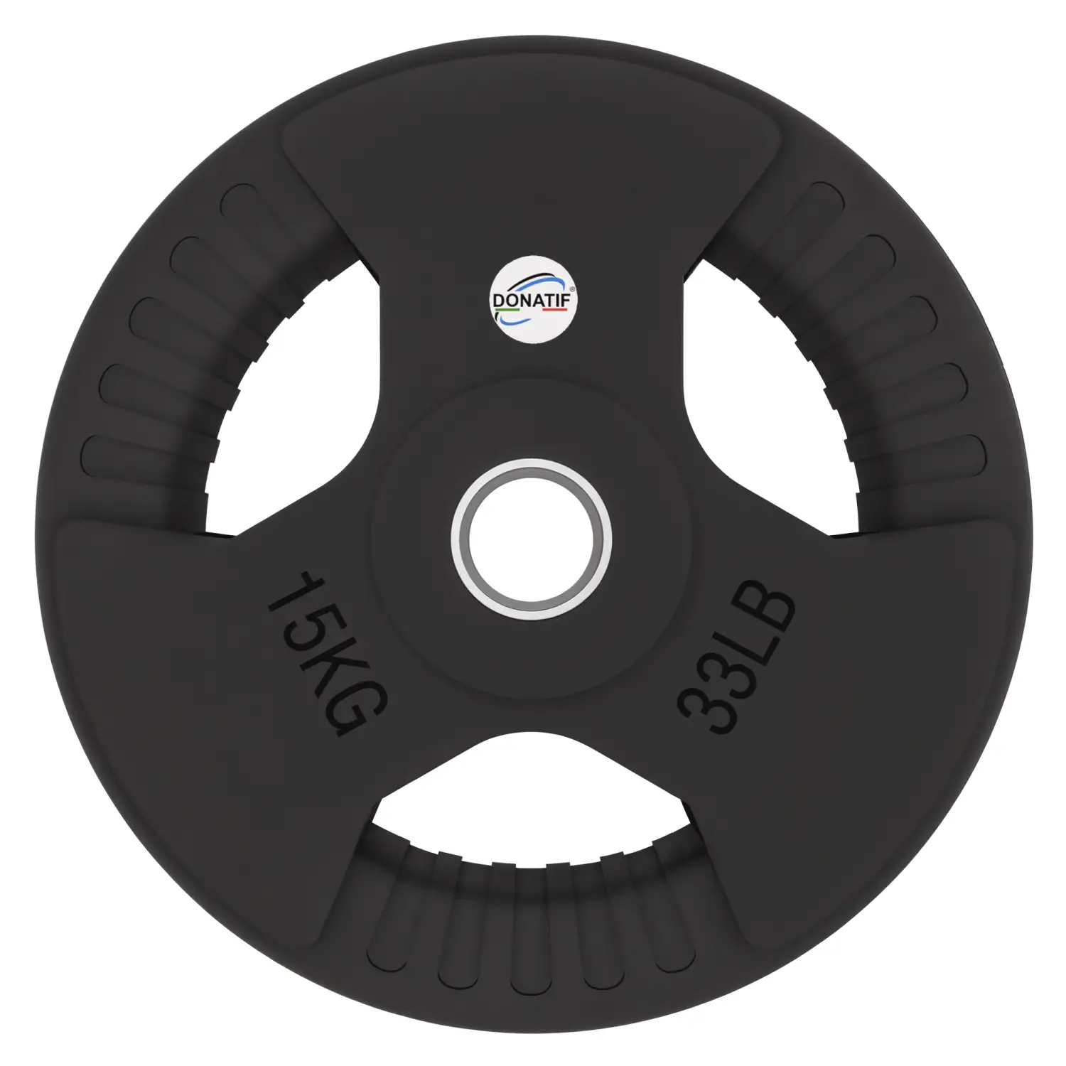 Die 15 kg gummierte Hantelscheibe mit Griffen von Donatif ist ein hochwertiges Produkt, ideal für jedes Fitnessstudio oder Home Gym. Es besteht aus Gusseisen und ist mit hochdichtem Gummi beschichtet, um eine höhere Haltbarkeit und Festigkeit zu gewährleisten. Diese Beschichtung schützt die Scheibe nicht nur vor Rost, sondern sorgt auch für eine deutliche Geräuschreduzierung während des Gebrauchs und einen optimalen Schutz des Bodens.