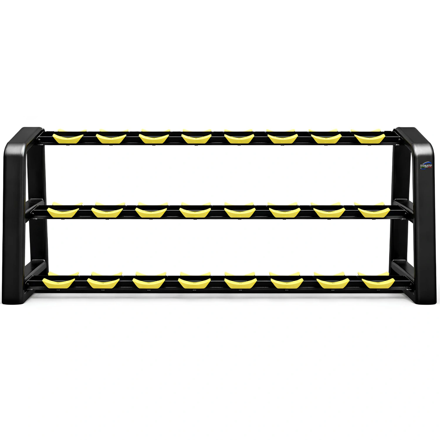 Dieses 3-Regal-Hantelgestell ist ideal zum Organisieren von Hanteln im privaten und gewerblichen Umfeld. Seine Fähigkeit, eine breite Palette von Gewichten aufzunehmen, macht es geeignet für Fitnessstudios, Fitnessstudios und Heimfitnessstudios. Das kompakte Design ermöglicht es, es einfach in begrenzten Räumen zu platzieren und so den Trainingsbereich zu optimieren. Die Montage ist schnell und einfach, sodass Sie sofort mit der Nutzung beginnen können. Aufgrund seiner Vielseitigkeit kann er verwendet werden, um Hanteln verschiedener Größe und Form zu lagern, wodurch der Trainingsbereich ordentlich und sicher bleibt.