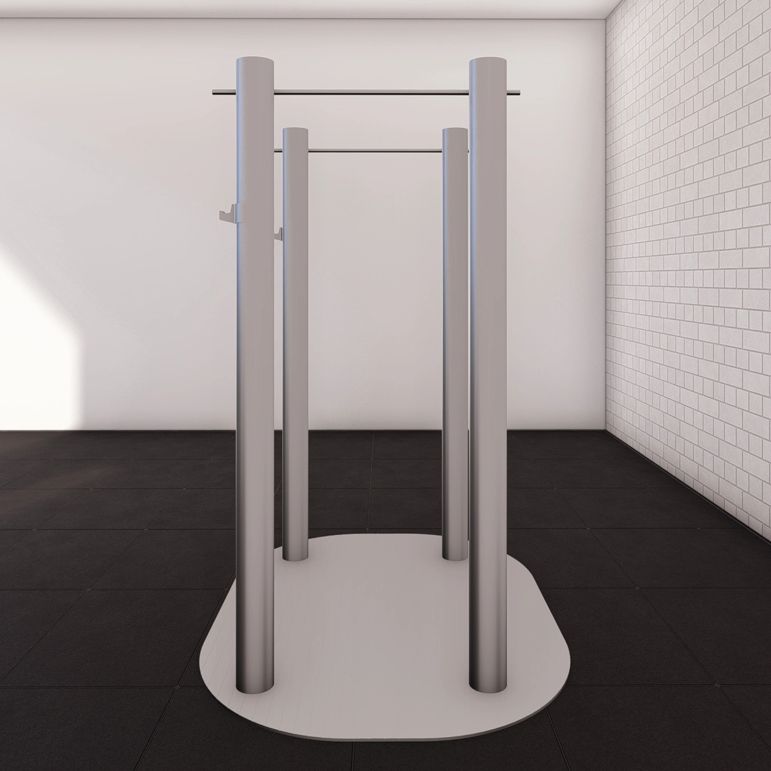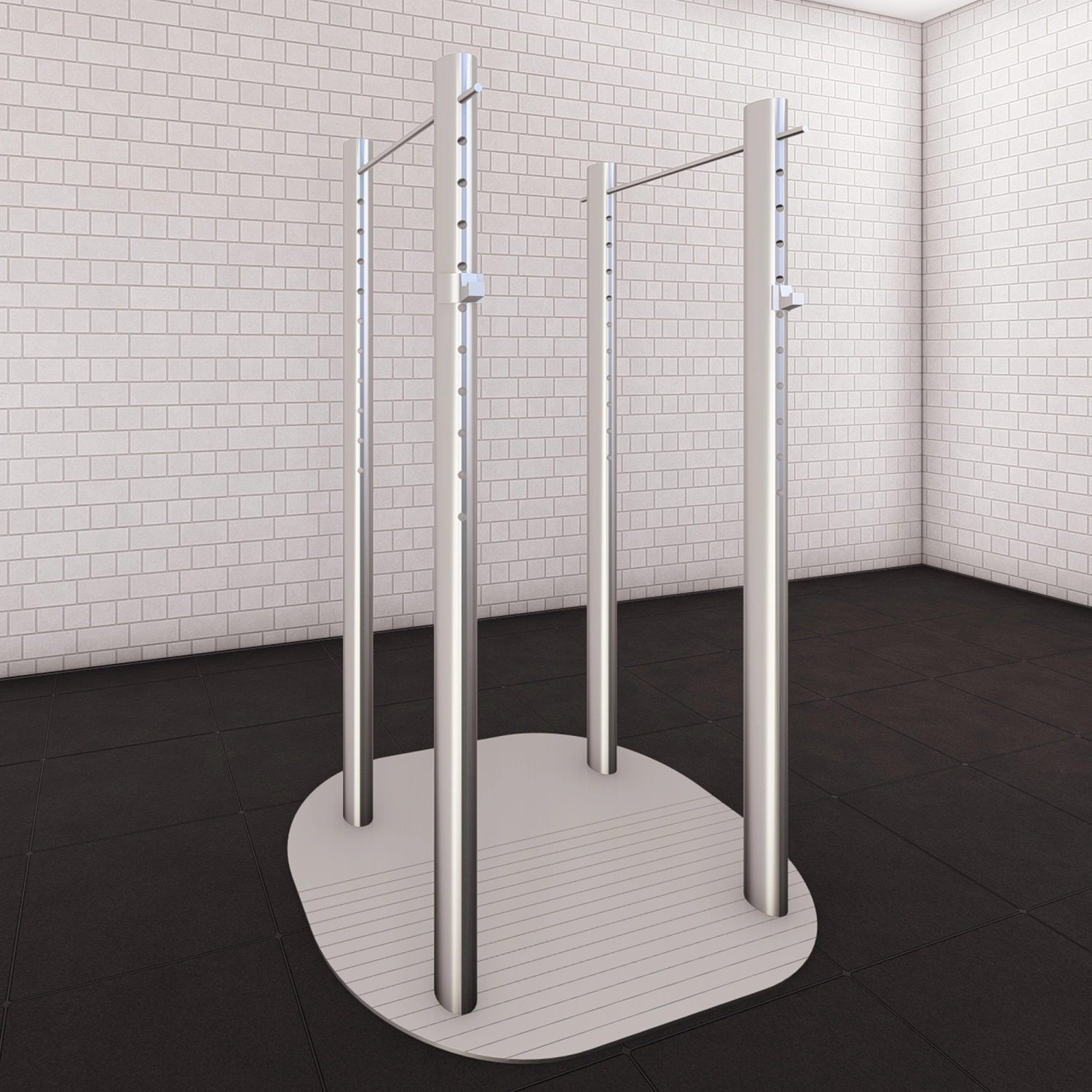 Die vier 150x70 mm großen ovalen Pfosten mit einer Dicke von 5 mm erreichen eine Höhe von 250 cm und sind mit 11 verstellbaren Löchern alle 10 cm, von 130 bis 240 cm, ausgestattet, für eine vollständig anpassbare Nutzung sowohl der Klimmzugstange als auch der Langhantelhalter.
