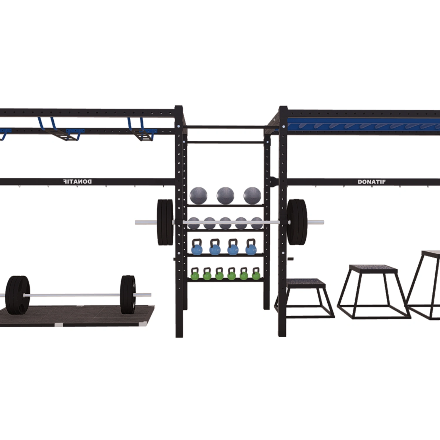 Im Lieferumfang enthalten sind: die Struktur, Taschen, T-Bars, Rekordhalter, Zubehör für Objekthalter, Dip-Stationen, J-Haken, möglicherweise ist es möglich, weitere Taschen zu kaufen. Weiteres Zubehör (wie Kettlebells, Discs, Medizinbälle, Langhanteln, Kreuzheben-Plattform, plyometrische Stühle) ist nicht im Lieferumfang enthalten .