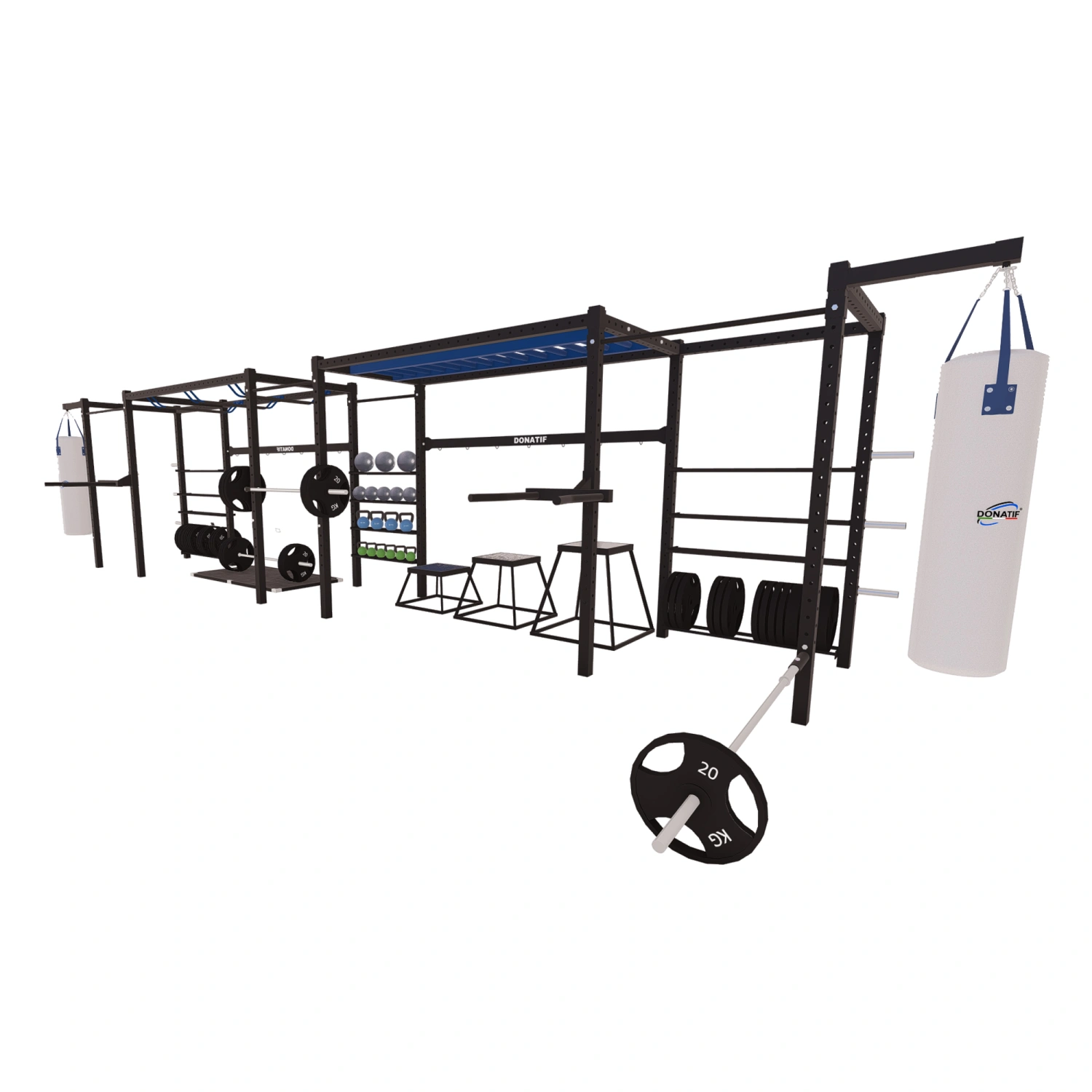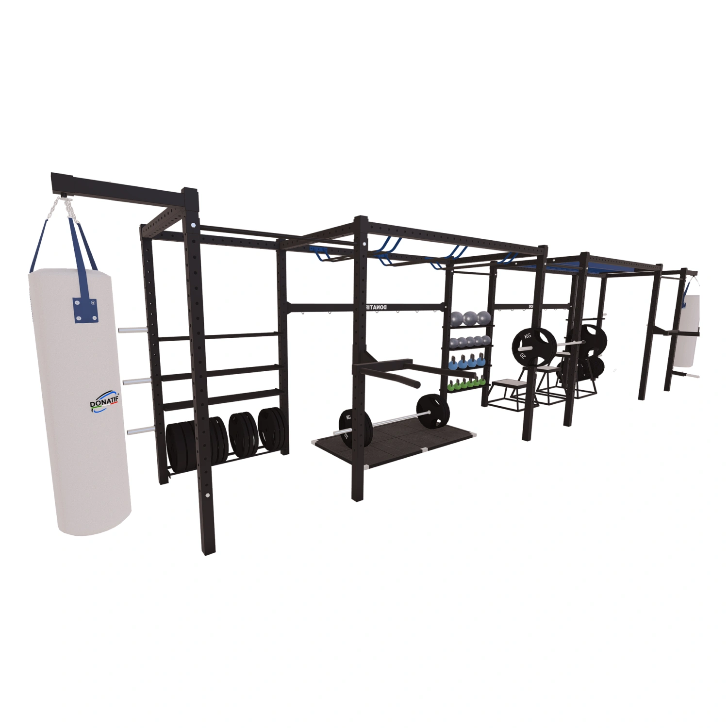 Geben Sie die gewünschten Anpassungen an und klicken Sie auf "Anpassung speichern".Das Multifunctional Combat Center - SC128 Donatif steht für Exzellenz in der Welt des funktionellen Trainings und des professionellen Athletiktrainings. Er besteht vollständig aus hochfestem Stahl und verwendet ein 80x80x3 mm großes Vierkantrohr, um maximale Festigkeit und Haltbarkeit zu gewährleisten. Die T-Flex-Beschichtung sorgt für zusätzlichen Schutz und erhöht die Widerstandsfähigkeit gegen Stöße und äußere Einflüsse. Die Grundausstattung umfasst: Stützkonstruktion, Boxsäcke, T-Bar, Rekordhalter, Objektzubehör, Tauchstationen und J-Haken. Jede Komponente ist für den intensiven Einsatz in professionellen Umgebungen wie Fitnessstudios und Sportzentren konzipiert. Die Struktur ist 10 Meter tief, 150 cm breit und erreicht eine Höhe von 270 cm, was einem Gesamtgewicht von 1000 kg entspricht. Es verfügt über zwei Arten von Leitern für Schnelligkeits-, Koordinations- und Ausdauerübungen, die sich perfekt für hochintensive Zirkel und Kämpfertraining eignen. Es gibt verschiedene Aufbewahrungsbereiche für Zubehör, darunter zentrale Haken für maximale Funktionalität. Die Beutel können sehr einfach neu positioniert oder entfernt werden, was eine Vielzahl von Konfigurationen ermöglicht. Schließlich ist die Struktur vollständig anpassbar: Größe, Farben, Anzahl der Taschen, Zubehör, Funktionalität und sogar das Logo des Fitnessstudios des Kunden können auf Wunsch integriert werden.