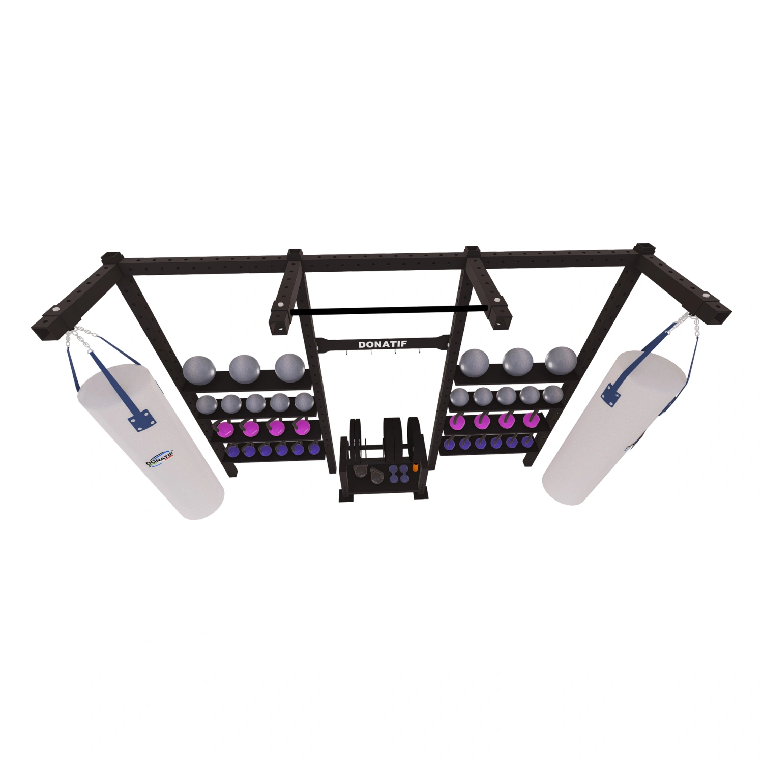 Dank seiner Modularität und der strategischen Anordnung der Ankerpunkte kann es schließlich Kettlebells, Discs, Battle Ropes und Medizinbälle (nicht im Lieferumfang enthalten) unterstützen und wird so zu einem echten Funktionszentrum für komplette und intensive Workouts.