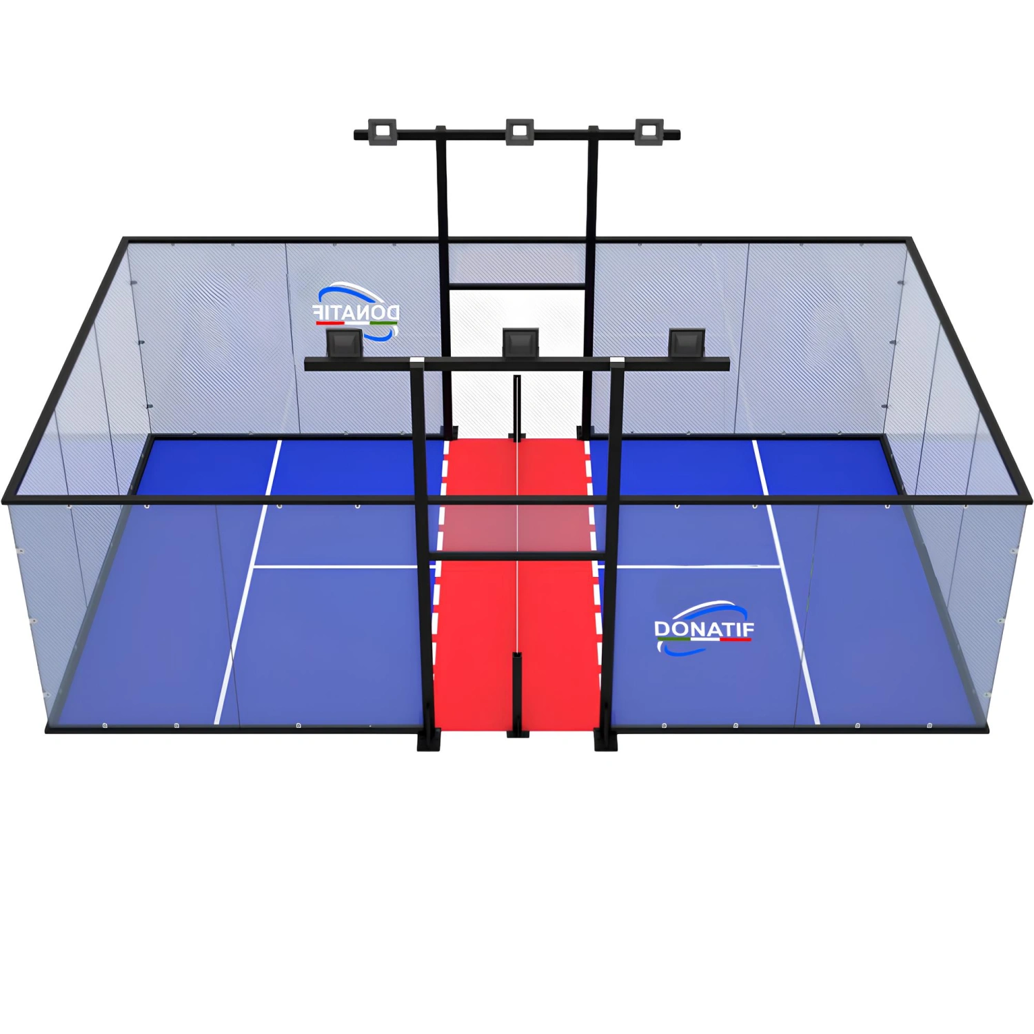 Das Netz aus hochwertiger Kunstfaser misst 6 Meter in der Länge und 0,8 Meter in der Höhe und hält dabei eine Bodenfreiheit von 20 cm ein, gemäß den offiziellen Vorschriften des Padbols. Das Panorama-Panzerglas ermöglicht eine ungehinderte und immersive Sicht auf das Spiel und macht diesen Platz perfekt für Turniere, Sportveranstaltungen und professionelles Training. LED-Lichtmasten sorgen für eine gleichmäßige, schattenfreie Ausleuchtung, ideal für Nachtspiele und Videoaufnahmen.