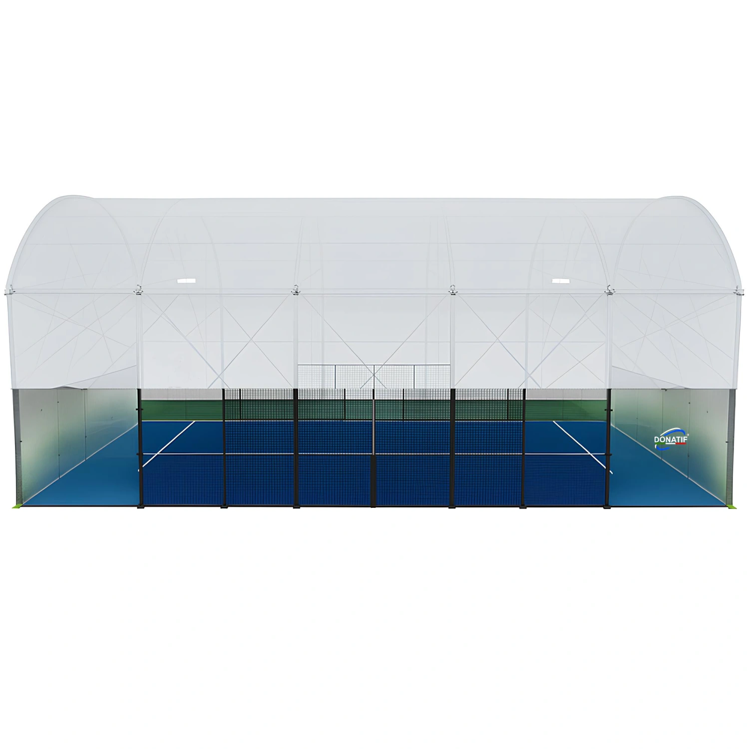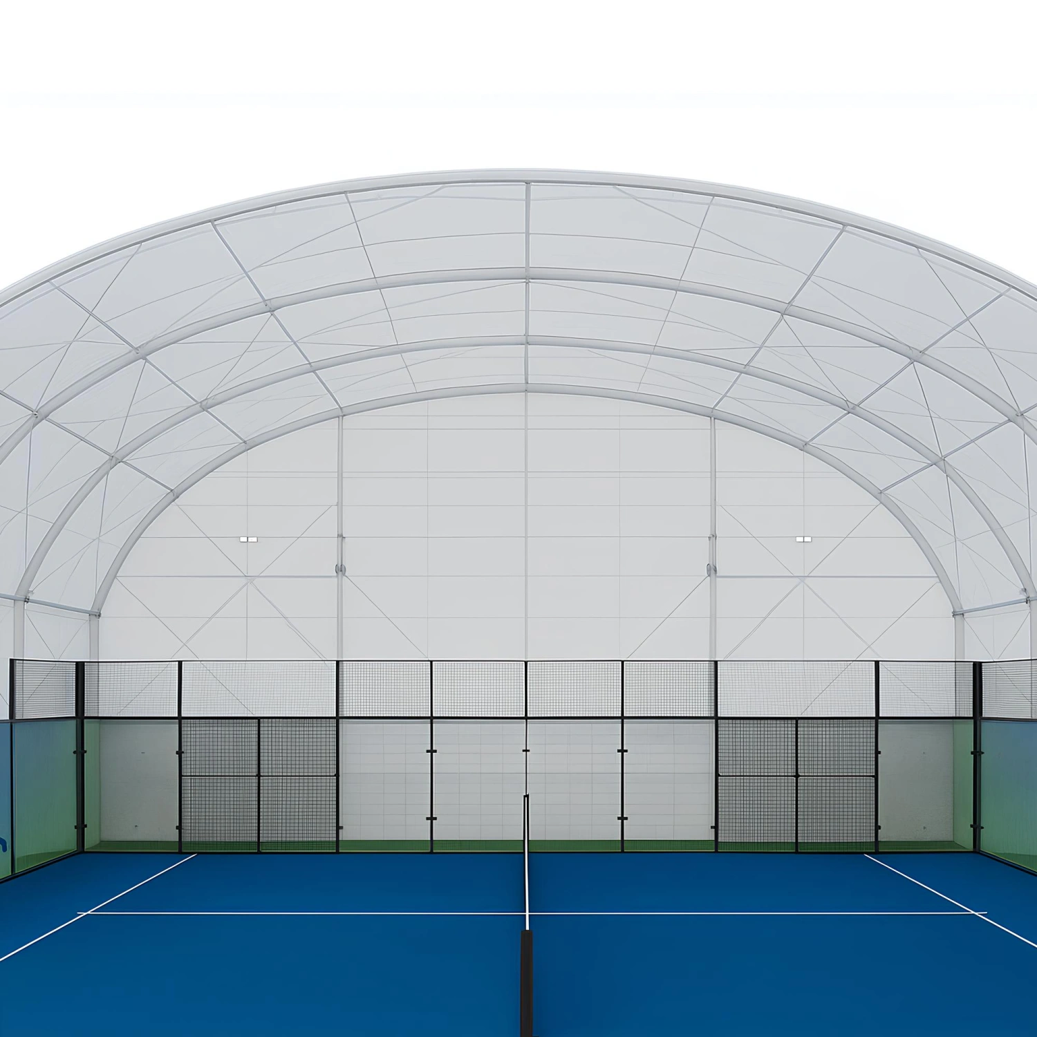 Der Padelplatz mit Seitenvorhängen ist eine professionelle Struktur, die entwickelt wurde, um eine hohe Leistung bei allen Wetterbedingungen zu gewährleisten. Die gesamte Abdeckung besteht aus 750 g/m² doppelt beschichtetem PVC , das stark und langlebig ist, ideal für den intensiven und kontinuierlichen Gebrauch.