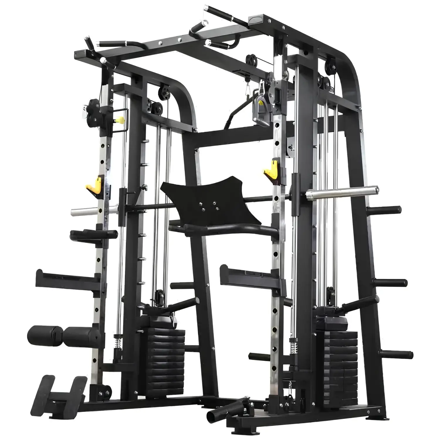 Die Fähigkeit, schweren Lasten standzuhalten, und die Stabilität, die seine Komponenten bieten, machen dieses Gerät zur idealen Wahl für Sportler und Fitnessbegeisterte, die ein zuverlässiges Gerät suchen. Darüber hinaus sorgt die Liebe zum Detail, wie z. B. Nylon-Umlenkrollen und Linearführungen, für ein reibungsloses und sicheres Trainingserlebnis.