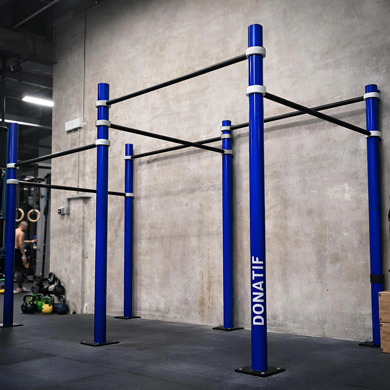 Dieses Rig ist ideal sowohl für den Innen- als auch für den Außeneinsatz. Seine Robustheit und Vielseitigkeit machen es perfekt für Fitnessstudios, Fitnesszentren und Außenbereiche wie Parks oder Gärten. Für die Außeninstallation wird vor der Pulverbeschichtung eine Verzinkungsbehandlung aufgebracht, die die Struktur vor Rost schützt und ihre Lebensdauer verlängert. Die Struktur ist außerdem mit Platten mit Löchern für Dübel ausgestattet, was eine einfache Verankerung am Boden ermöglicht, was für die Sicherheit während der Ausbildung unerlässlich ist. Dank seiner modularen Konfiguration können Sie die Struktur für eine Vielzahl von Übungen nutzen, darunter Klimmzüge, Dips und andere typische Aktivitäten wie Calisthenics und Straßentraining.