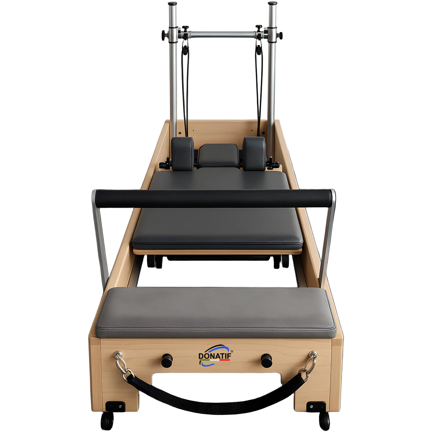 Dieser Reformer mit PM29-Aluminiumstangen ist ideal für professionelle Kontexte wie Pilates-Studios und Sportzentren. Dank seines kompakten Designs passt er leicht in enge Räume, was eine flexible Positionierung ermöglicht, ohne die Trainingsfunktionalität zu beeinträchtigen. Die PM29-Konfiguration ist darauf ausgelegt, sowohl den Bedürfnissen von Anfängern als auch Profis gerecht zu werden und bietet ein reibungsloses, sicheres und leistungsstarkes Erlebnis. Jeder Sitz ist so gestaltet, dass er durch ergonomische, hochdichte Schaumstoffpolster und Schultergurte maximalen Komfort und Unterstützung gewährleistet, die auch bei längeren Einheiten helfen, Muskelermüdung zu reduzieren. Die strukturierte Plattform bietet eine stabile und sichere Unterstützung für präzise, kontrollierte und progressive Übungen. Dieser Reformer ermöglicht es Ihnen, den ganzen Körper vollständig zu trainieren, mit besonderem Fokus auf Bauch, Gesäß, Paravertebralmuskeln, Rücken und untere Gliedmaßen, wodurch Kraft, Flexibilität und neuromuskuläre Kontrolle verbessert werden.