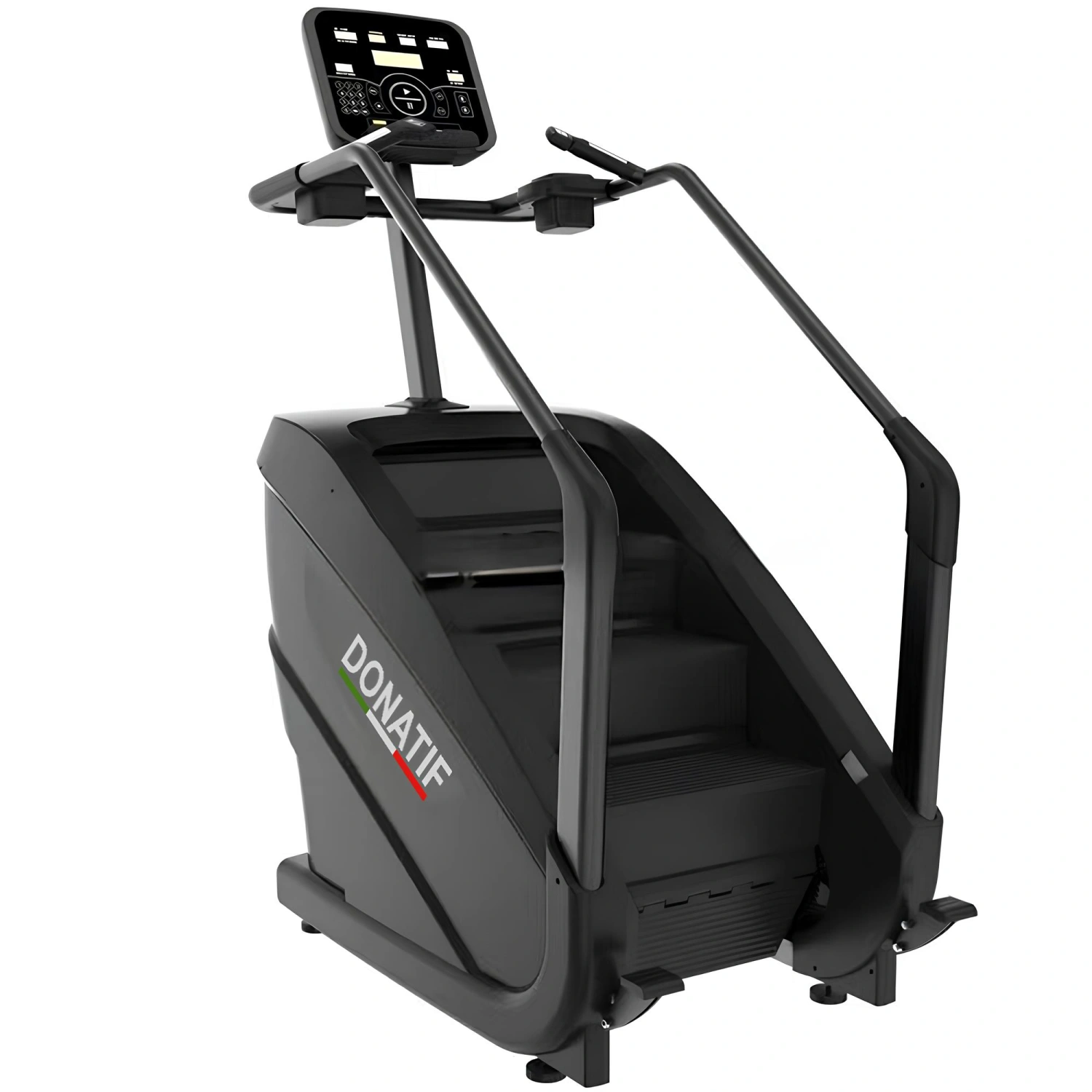 Der schwarze Treppensteiger mit Display ist ideal für Fitnessstudios, Fitnesscenter und Sporteinrichtungen, die ihren Kunden ein effektives und vollständiges Herz-Kreislauf-Training anbieten möchten. Durch die Simulation der natürlichen Bewegung des Treppensteigens ermöglicht Ihnen dieses Gerät, die kardiovaskuläre Ausdauer zu verbessern, Ihre Bein- und Gesäßmuskulatur zu straffen und Kalorien effizient zu verbrennen.