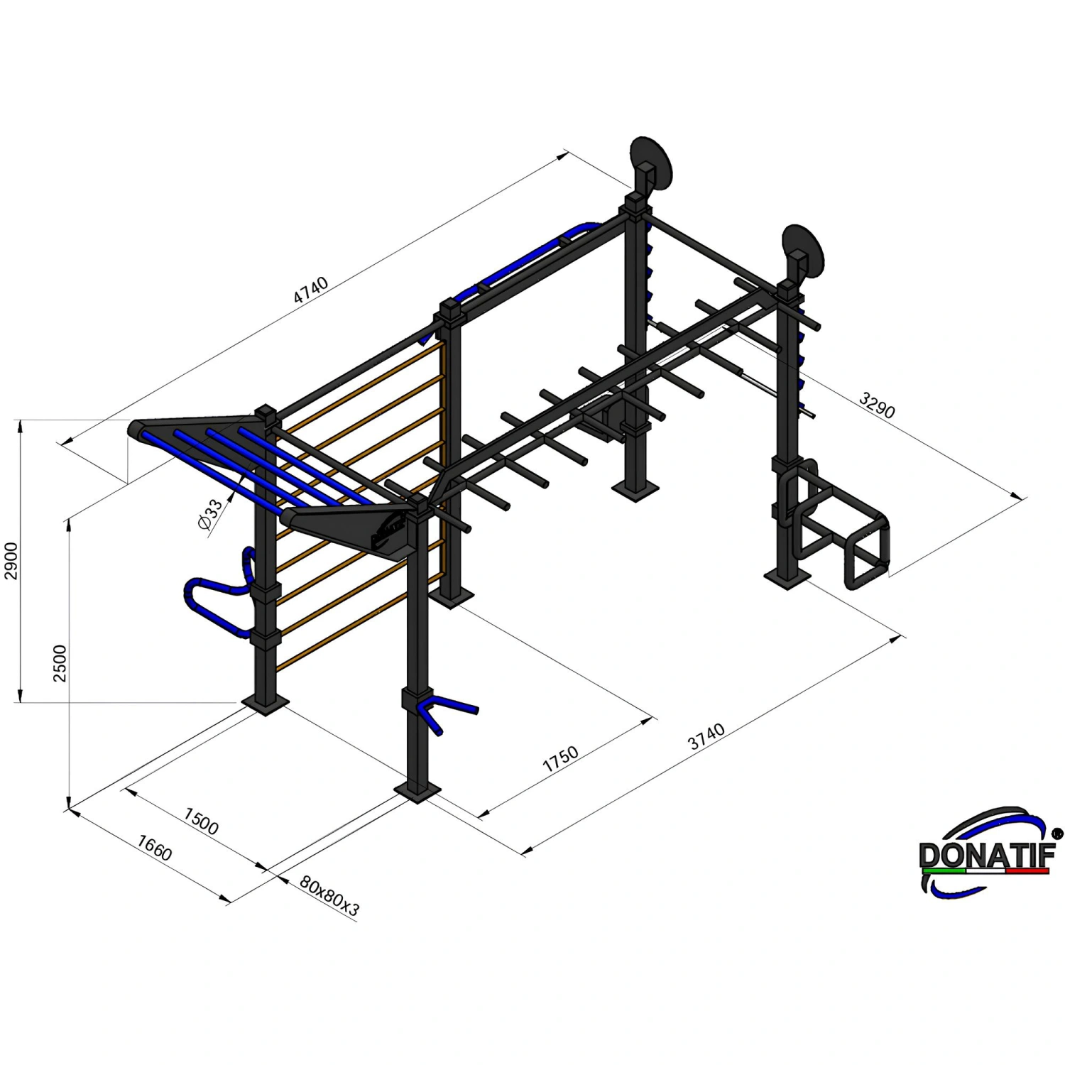 Geben Sie die gewünschten Anpassungen an und klicken Sie auf "Anpassung speichern".Diese Struktur mit Langhantelstützen - CH60 Outdoor-Training ist eine solide und imposante Struktur, die vollständig aus Stahl mit einem Vierkantrohr von 80x80x3 mm gebaut ist, um auch bei den intensivsten Übungen Stabilität zu gewährleisten. Jedes Detail ist so konzipiert, dass es im Laufe der Zeit standhält: Die Feuerverzinkung schützt vor Korrosionserscheinungen, während die Pulverbeschichtung eine moderne Ästhetik und zusätzlichen Schutz vor Verschleiß und Witterungseinflüssen bietet. Seine großzügigen Abmessungen (474 cm tief, 329 cm breit und 290 cm hoch) ermöglichen eine Vielzahl von Einsatzmöglichkeiten, mit Elementen, die für Klimmzüge, Steigungen und Traversen bestimmt sind. Die 120 cm langen Stangen mit einem Durchmesser von 33 mm sorgen für einen optimalen Halt für Calisthenics und OCR, während die Seitenmodule die Struktur mit geneigten und vertikalen Treppen vervollständigen.