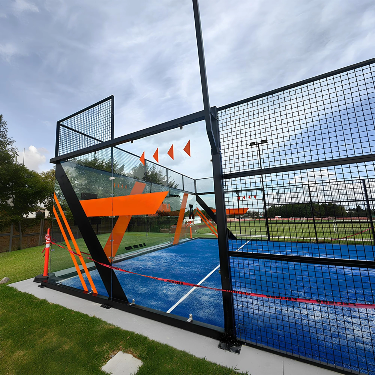 Choosing the Panoramic Padel Field means relying on a complete professional solution designed to ensure maximum aesthetic, functional and sporting performance. Every detail is designed to meet the highest criteria in terms of safety, quality and design. From the transparency and sturdiness of the tempered glass to the stability of the net and steel structure, to the high-performance KDK synthetic turf: each element is the result of careful selection and complies with European standards. The field is also panoramic, so there are no uprights between the glass or uprights at the corners.