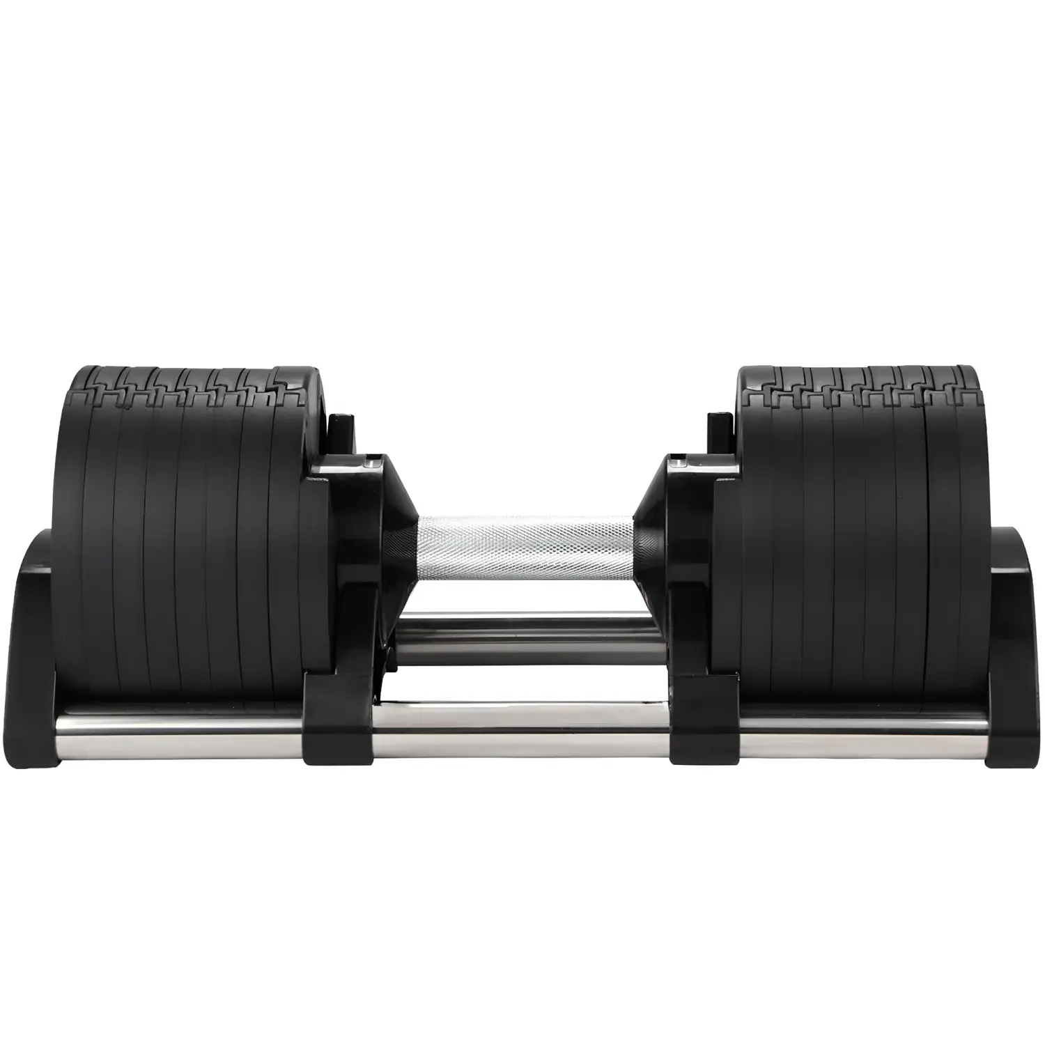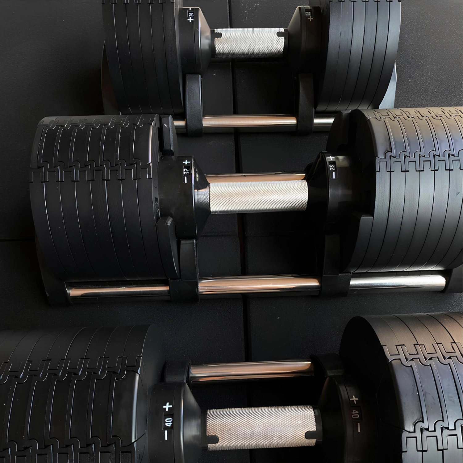 To adjust the weight, simply place the dumbbell in its base and turn the handle until the desired load is selected. This system saves time and avoids the assembly and disassembly of the discs, making training more efficient and safer.