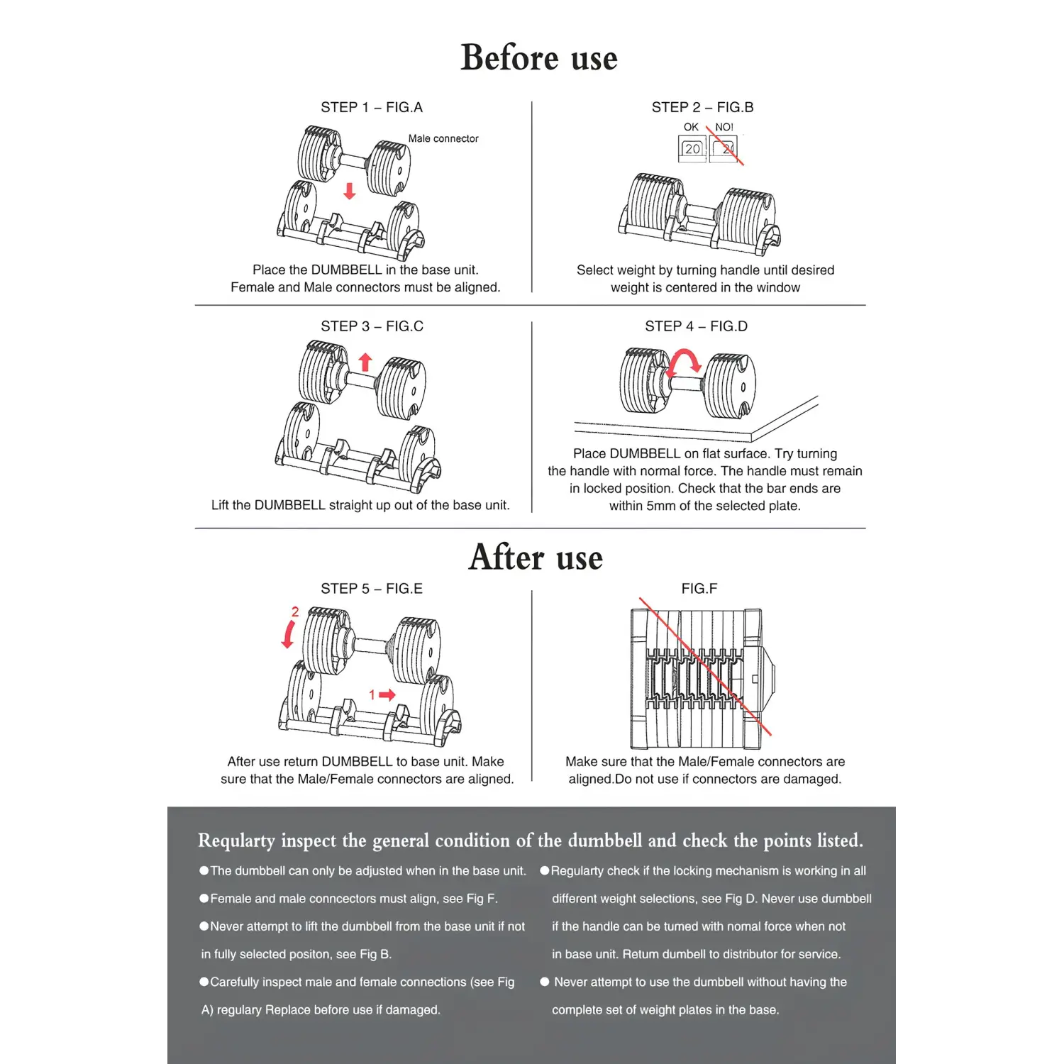 Note: It is recommended to rotate the handle of the dumbbells slowly and adjust the weight every 4 kg, to avoid the risk of damage. Refunds cannot be made for damage to the trigger dumbbells caused by use not in accordance with the instructions. The safety and durability of the product are only guaranteed if the given guidelines are followed. For further clarification, we are available.