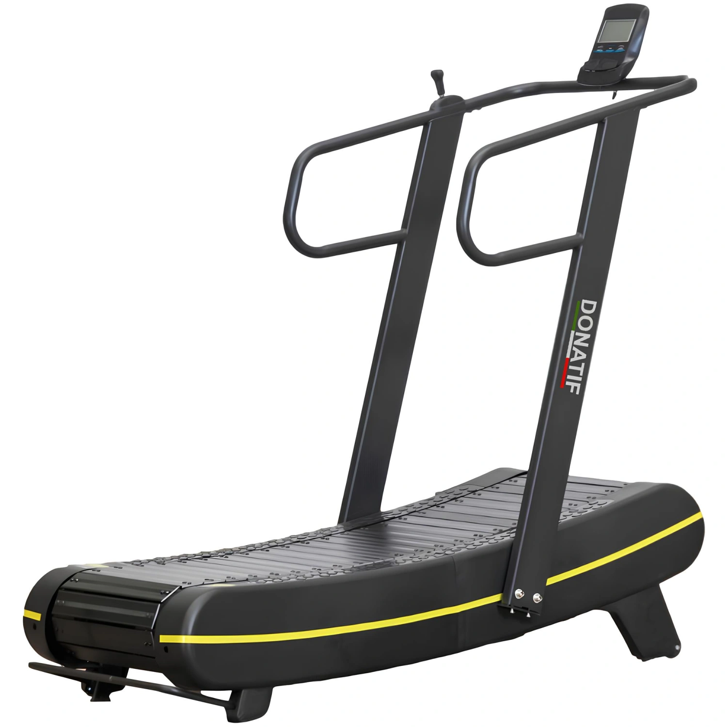 The Curved Mechanical Treadmill - TRC10 is ideal for a variety of workouts, allowing you to customize your workout to your needs and abilities, improving cardiorespiratory endurance and muscle strength. Our treadmill is an innovative piece of equipment designed to provide a natural and effective running experience. Thanks to its motor-free structure, the movement of the belt is fully regulated by the user, allowing you to adapt the intensity of your workout according to your speed and effort. This makes it ideal for a wide range of exercises, from light walking to intense running sessions. Its versatility makes it perfect for professional use, ensuring a complete and high-performance workout. One of the biggest benefits of TRC 10 is its impact on muscle groups. The curved design forces the body to generate a more intense thrust than electric treadmills, actively engaging the quadriceps, hamstrings, and calves, which work to support movement and ensure a smooth ride. The buttocks are stressed especially in the sprint or acceleration phases, contributing to the power and stability of the pelvis. The core also plays a fundamental role: the abdominals and lumbar muscles are activated to maintain correct posture and improve movement efficiency. Finally, the arms and shoulders also participate in the training, aiding in coordination and balance while running. In addition to the muscle benefits, the Curved Mechanical Treadmill - TRC 10 allows you to improve cardiovascular endurance thanks to the greater energy expenditure required compared to traditional models. The smooth, natural movement reduces stress on the joints, while the absence of electrical components makes it an eco-friendly and low-maintenance choice. With the TRC 10, every training session becomes an immersive, customizable, and highly effective experience for those who want to get the most out of their workouts.