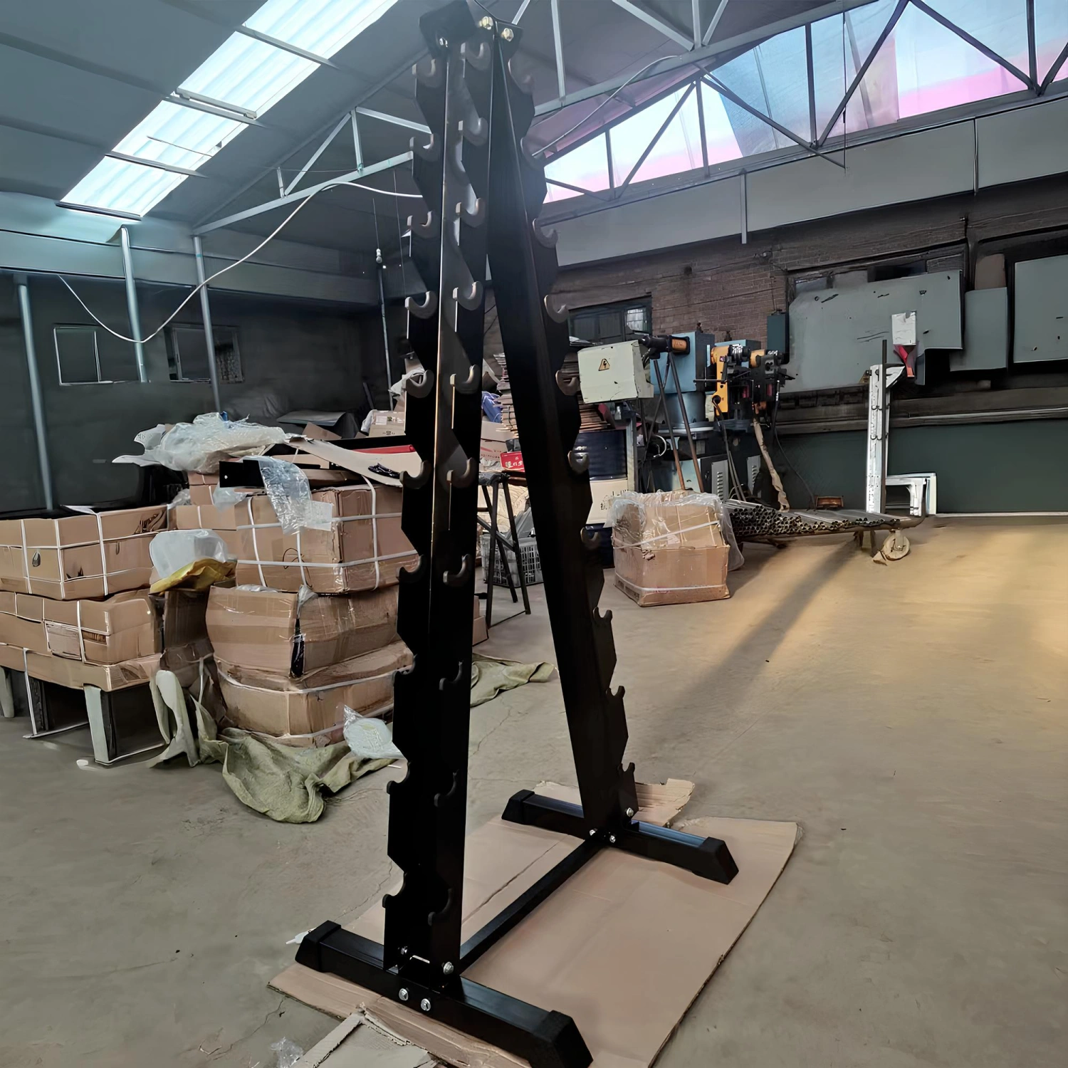 This Vertical Rack is perfect for those who need to optimize the space in their fitness area. It is ideal for both professional gyms and home gyms, thanks to its compact design that allows you to store up to ten pairs of dumbbells in a neat and accessible way. It can be easily placed in a corner, making it easy to access the dumbbells during your workout. The vertical arrangement allows for ergonomic removal and repositioning of the dumbbells, improving training efficiency and keeping the area tidy and safe at all times. The rack fits different types of dumbbells, from the lightest to the heaviest, making it versatile for any training program.