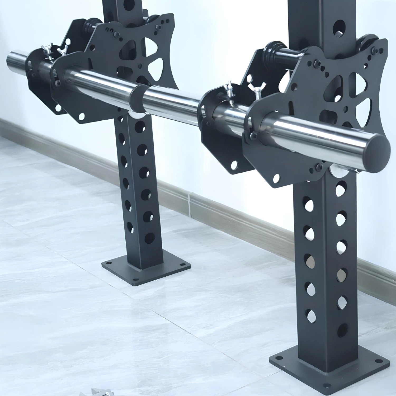 El accesorio está diseñado para instalarse en bastidores profesionales y es ideal para su uso en gimnasios domésticos, centros de fitness y estudios de entrenamiento personal. El montaje es rápido y sencillo: basta con fijar los dos elementos deslizantes en los montantes de la estantería, teniendo cuidado de alinearlos a la altura deseada. Una vez instalada, simplemente inserte su barra en los orificios del accesorio para comenzar a usar la máquina Smith de manera segura.