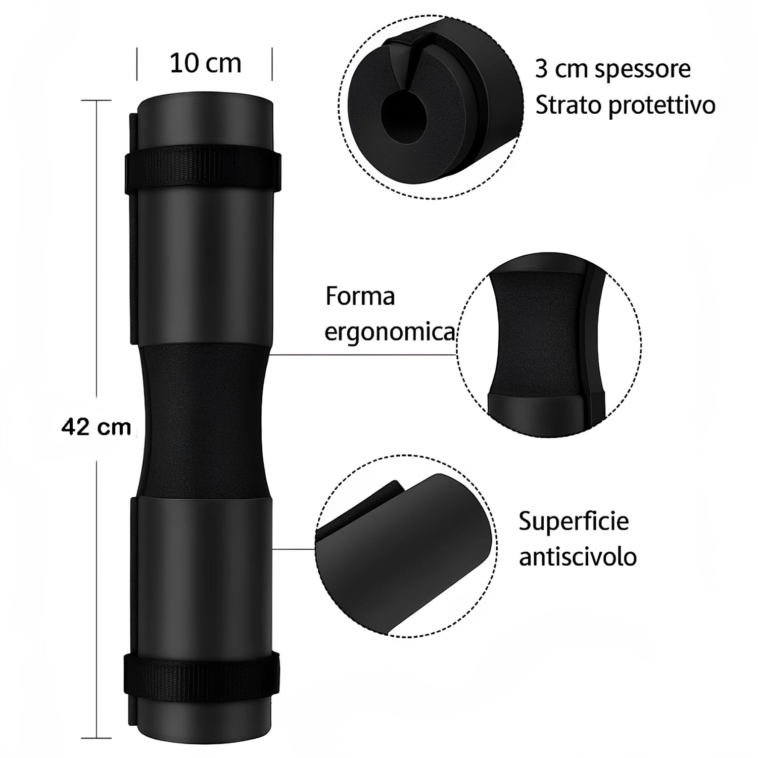 Se adapta a cualquier barra, con un diámetro de 10 cm, y cubre unos impresionantes 42 cm de longitud, ofreciendo una protección central para hombros y cuello. El color negro combina funcionalidad con estilo minimalista, ideal para entrenar con elegancia.