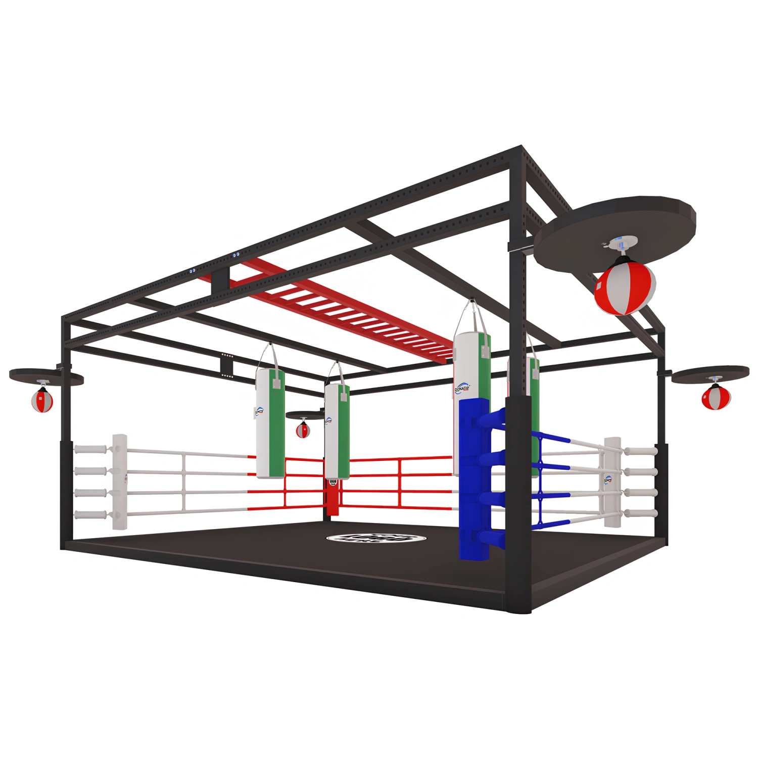 Nuestro Anillo con Estructura Multifunción y Bolsas, Peras - SC170 está diseñado para gimnasios profesionales y centros deportivos que desean maximizar el espacio disponible y ofrecer a sus clientes equipos completos y versátiles. Esta solución permite organizar sesiones de entrenamiento en grupo, donde varios deportistas pueden trabajar a la vez utilizando tanto el anillo como las estaciones con bolsas y peras. Es perfecto para el entrenamiento en circuito, ya que el lado abierto facilita el cambio rápido entre ejercicios, lo que hace que el entrenamiento sea suave y dinámico. La configuración modular es ideal para boxeo, kickboxing y otras disciplinas de combate, permitiendo ejercicios técnicos tanto en el ring como en las estaciones laterales. La instalación del producto es rápida y sencilla, gracias al hardware incluido.