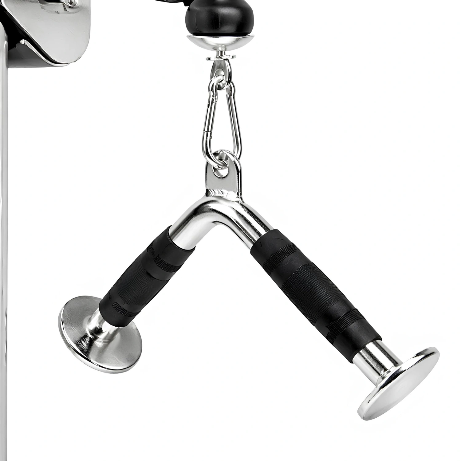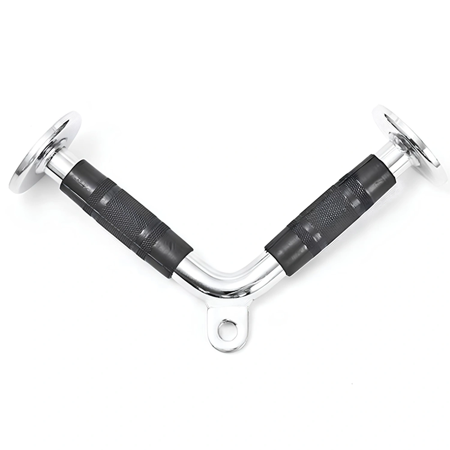 La barra de tríceps con mango en V está diseñada para usarse con máquinas guiadas por cable, que se encuentran comúnmente en gimnasios profesionales y gimnasios domésticos bien equipados. Este accesorio es especialmente adecuado para realizar ejercicios como extensiones de tríceps, pull-downs y otros movimientos de aislamiento muscular del brazo. Gracias a su forma de V, la barra permite un amplio rango de movimiento, facilitando una contracción completa del músculo durante cada repetición. El uso de la barra no solo se limita al gimnasio, sino que también es perfecto para entrenamientos en casa, donde el espacio puede ser limitado pero aún desea equipo profesional. La facilidad de montaje y la compatibilidad con diferentes tipos de máquinas hacen de este accesorio un imprescindible para cualquier persona que quiera potenciar su rutina de entrenamiento.