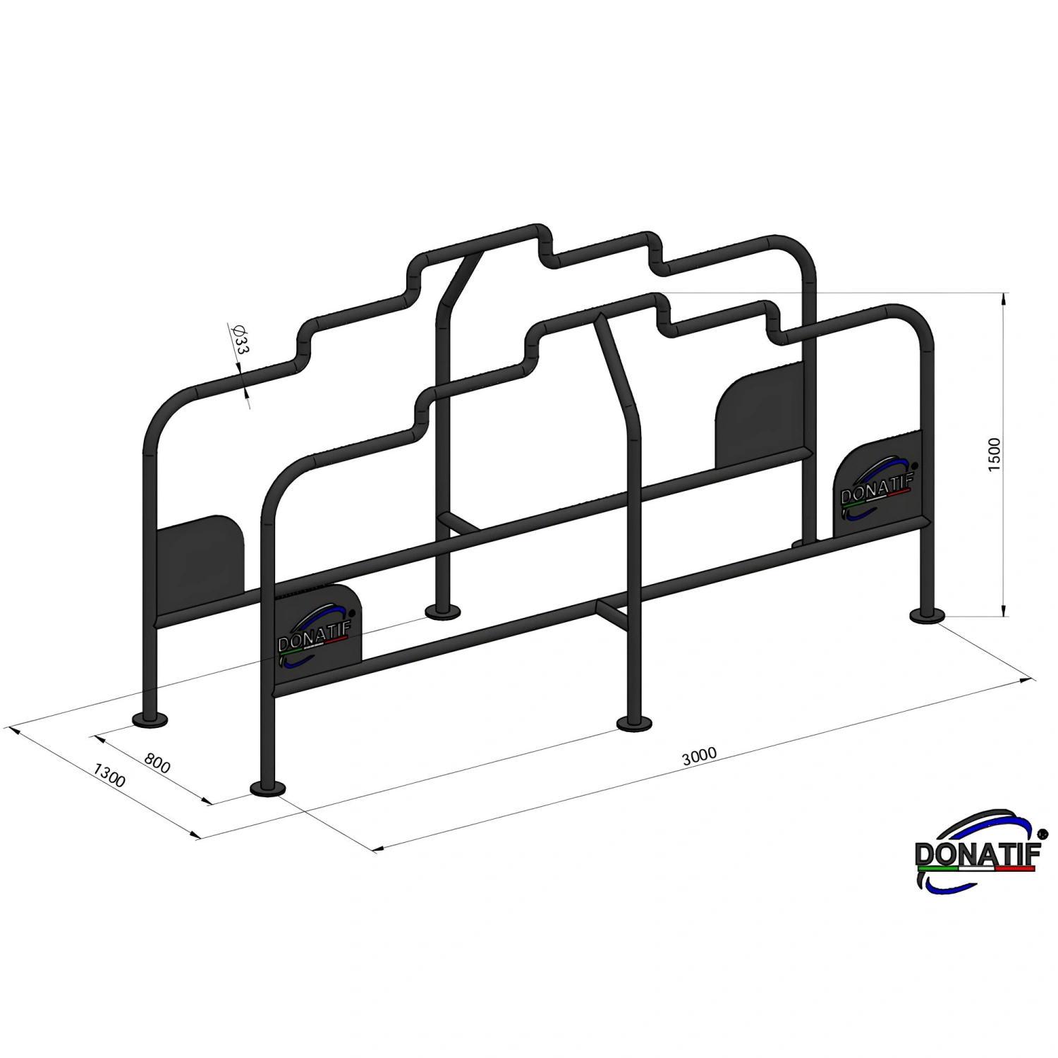 Indica las personalizaciones que deseas y haz clic en 'Guardar personalización'Las Barras Paralelas de Calistenia Multinivel - CH81 son barras paralelas diseñadas para ofrecer un entrenamiento completo y diversificado en el mundo de la calistenia, el entrenamiento funcional y el OCR. La estructura está fabricada en acero de alta calidad con tubos cuadrados de 80x80x3 mm, sometidos a un tratamiento de galvanizado en caliente y recubrimiento en polvo, para garantizar la máxima resistencia al óxido, al desgaste y a la intemperie. La configuración se caracteriza por dos pasillos paralelos con pasamanos conformados a múltiples alturas que permiten agarres y apoyos diferenciados. Esta solución está diseñada para variar la intensidad de los ejercicios, haciendo que la estructura sea adecuada tanto para principiantes como para atletas experimentados. Con una profundidad de 300 cm, una anchura de 130 cm, una altura de 150 cm y un peso de 80 kg, el CH81 ofrece estabilidad, seguridad y un amplio espacio para su uso.