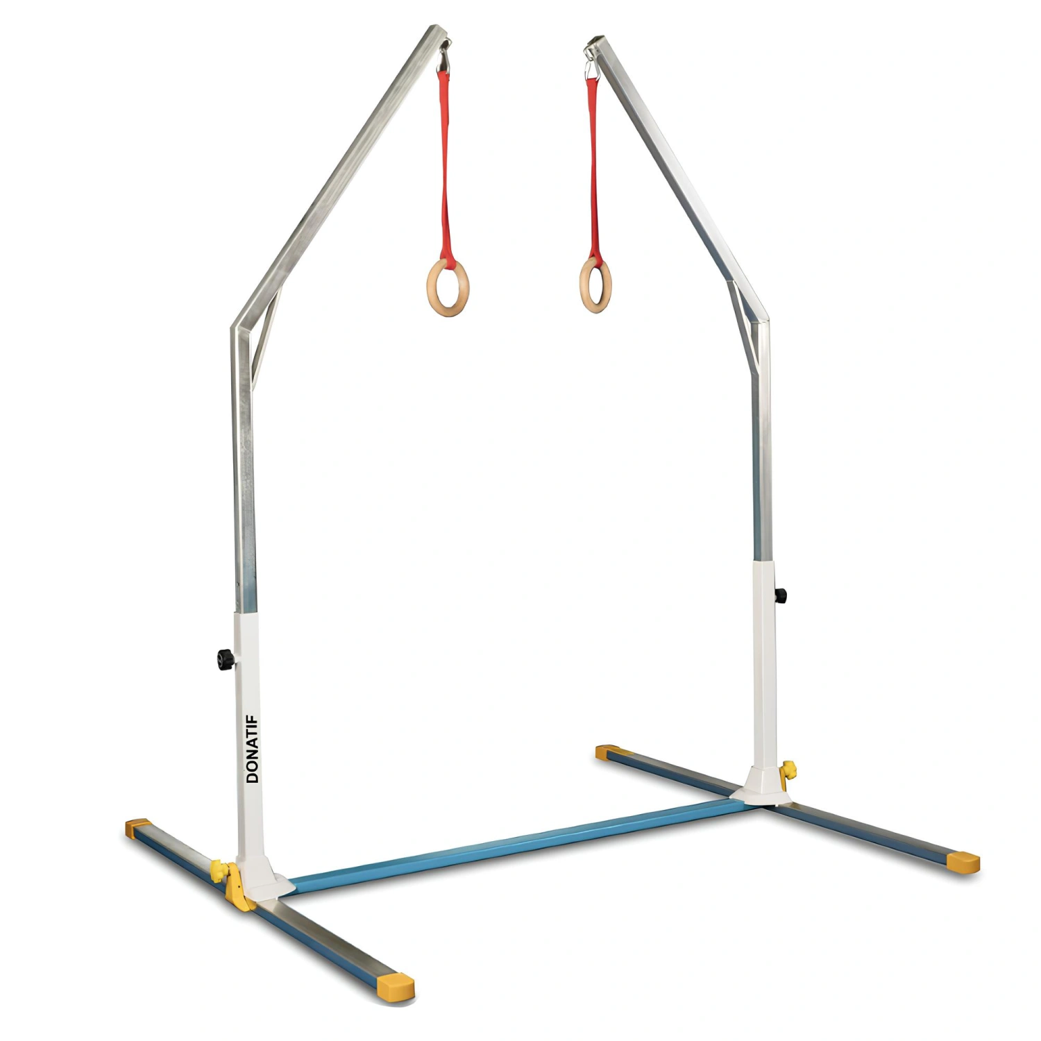 El Donatif Castillo para Anillos para niños está diseñado para su uso en gimnasios juveniles, centros deportivos, escuelas y asociaciones de aficionados que ofrecen cursos de gimnasia artística para niños. Gracias al sistema de ajuste de altura, puede ser utilizado por niños de diferentes edades, lo que lo hace perfecto tanto para actividades motoras básicas como para programas de entrenamiento específicos.