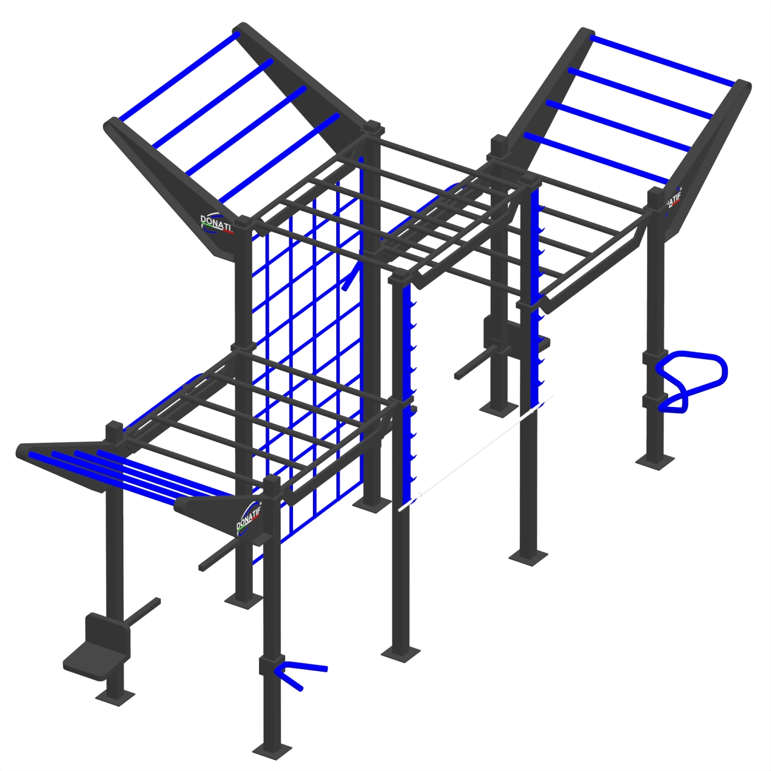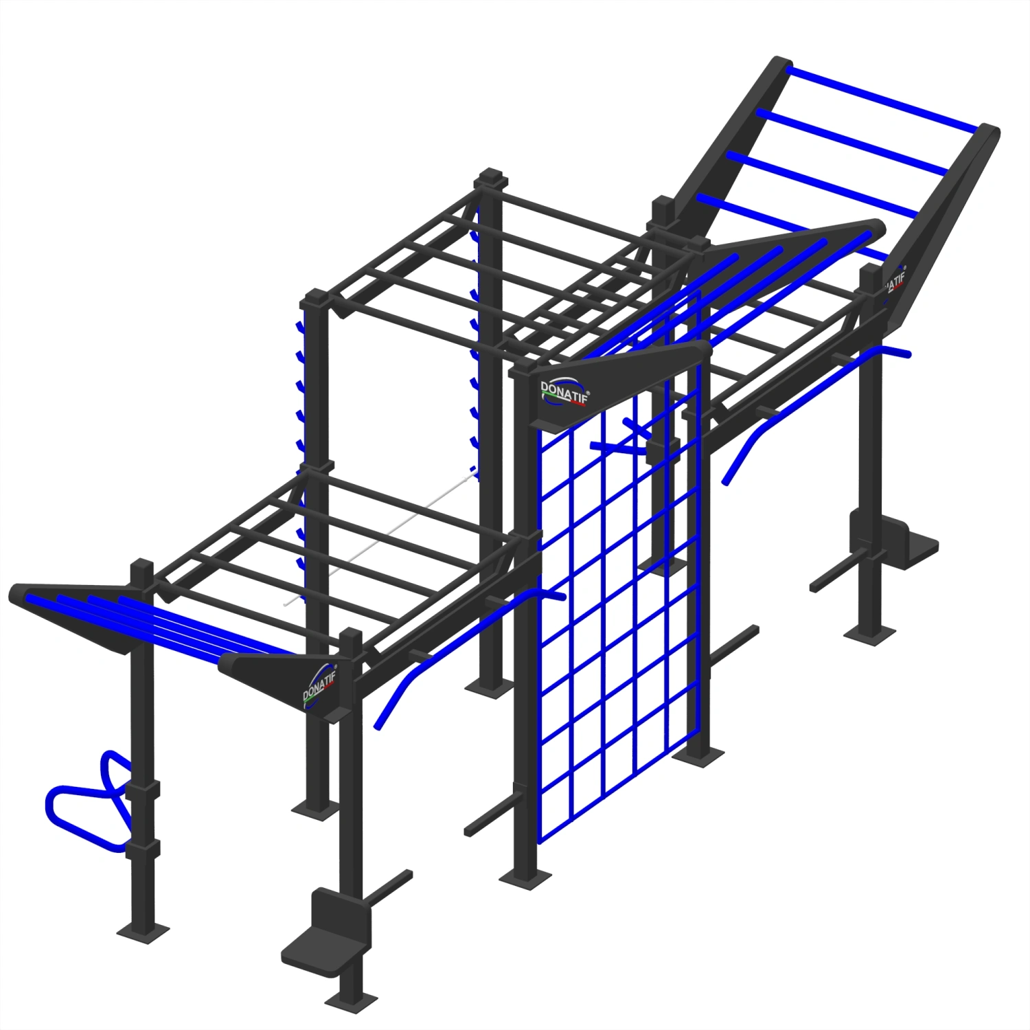 Este equipo de entrenamiento múltiple es un sistema vertical compacto diseñado para ofrecer entrenamiento OCR, funcional y ninja en una sola solución. En los dos extremos encontramos rampas oblicuas con barras de mono inclinadas, perfectas para tirar, empujar y transiciones cuesta arriba o cuesta abajo, que ponen a prueba la fuerza y la coordinación. En el centro domina una gran red de escalada vertical, que separa dos zonas y permite ejercicios de escalada, columpios y control del cuerpo en suspensión. Las secciones horizontales están compuestas por barras lineales y módulos de barras múltiples, ideales para dominadas, colgaduras y pasajes dinámicos. Varios elementos accesorios completan la estructura: asas paralelas para fondos o ejercicios isométricos, una sola barra para dominadas, superficies de apoyo para abdominales y una cuerda con un anillo para el agarre y el trabajo de swing. Robusto, modular y compacto, es perfecto para entrenamientos de alta intensidad en espacios verticales.