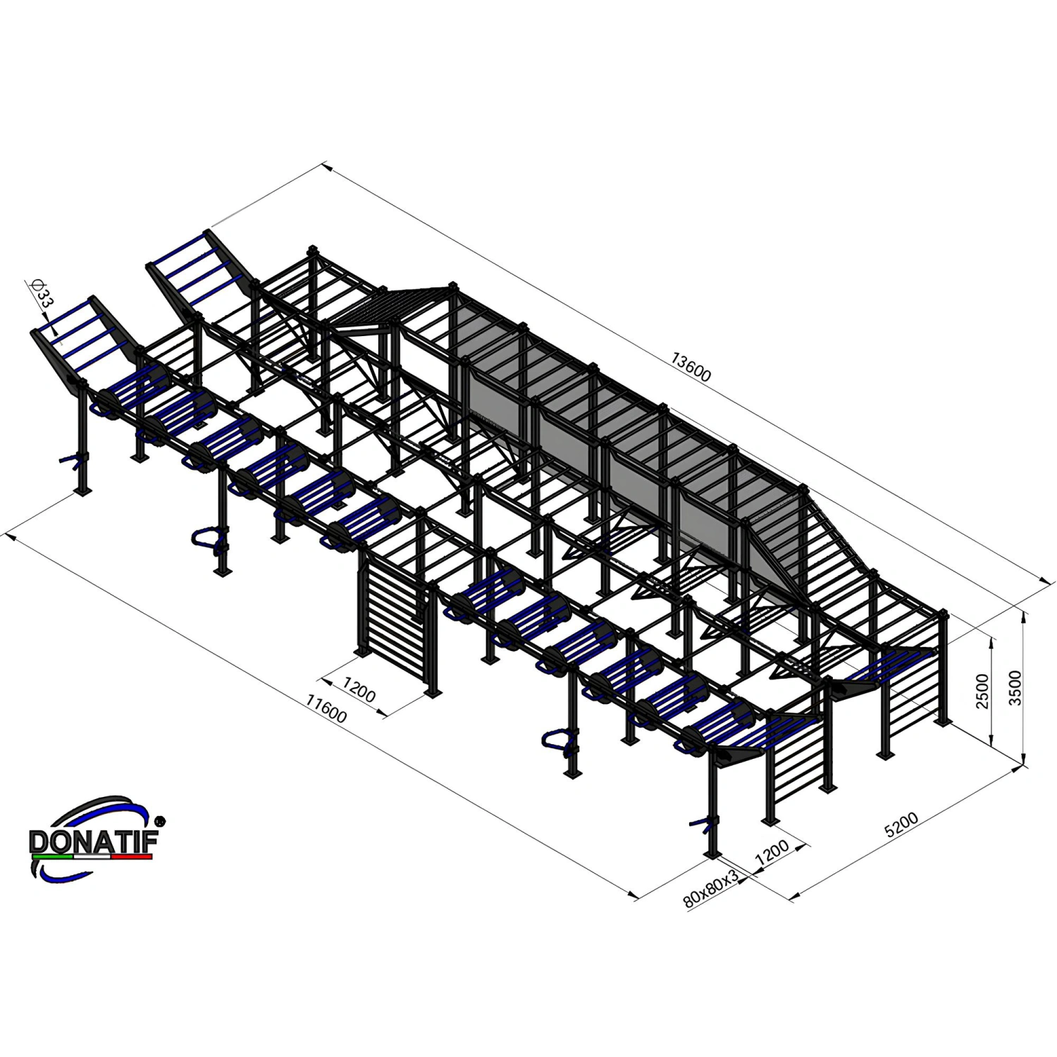 Esta estructura multiplataforma para el entrenamiento de obstáculos y ninjas es una solución completa y profesional diseñada para el entrenamiento funcional de alta intensidad. Consiste en un largo rocódromo inclinado con presas de colores, perfecto para ejercicios de agarre y escalada, flanqueado por numerosos tramos de barras de mono en diferentes configuraciones: lineales, inclinados, móviles y con discos giratorios. Integra escaleras verticales e inclinadas, módulos oscilantes con anillas, triángulos y cuerdas tensas, que permiten variar los ejercicios y simular caminos al estilo guerrero ninja. La estructura, fabricada íntegramente en acero, es modular, robusta y apta tanto para espacios exteriores, por lo que es ideal para gimnasios, OCR y centros de entrenamiento atlético.