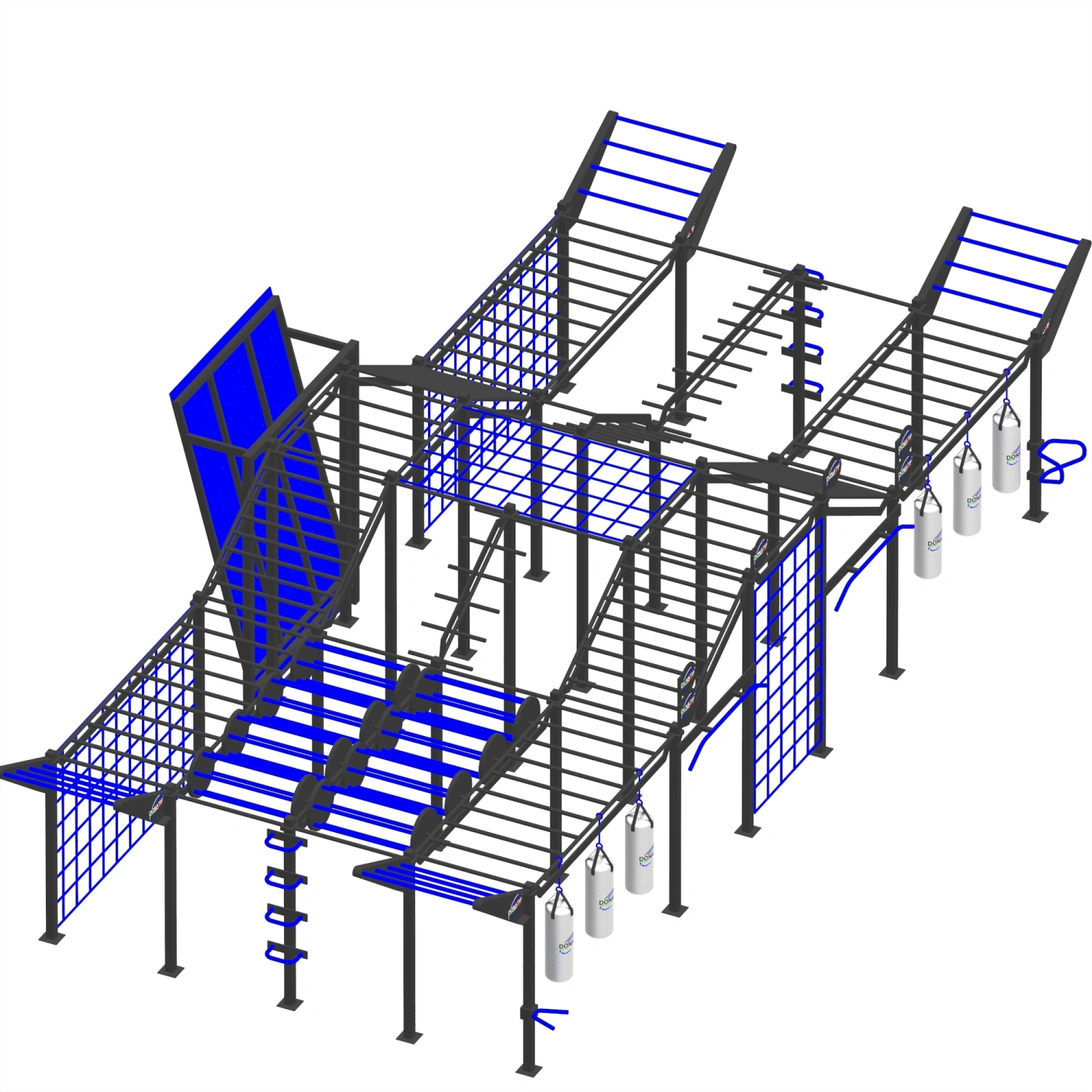 Esta estructura multiplataforma para entrenamiento táctico y de obstáculos está diseñada para ofrecer un recorrido completo de alta intensidad. Incluye múltiples barras de mono en diferentes niveles, sacos de boxeo colgantes, escaleras verticales, rejillas de escalada, rampas inclinadas con barras y una impresionante pared central azul para escaladas técnicas. También cuenta con plataformas inclinadas con discos giratorios, secciones de vigas oblicuas para coordinación, escalones laterales, asideros horizontales y módulos suspendidos para columpios y transiciones. La estructura está diseñada para un uso intensivo en exteriores, ideal para entrenamiento funcional, militar y OCR.