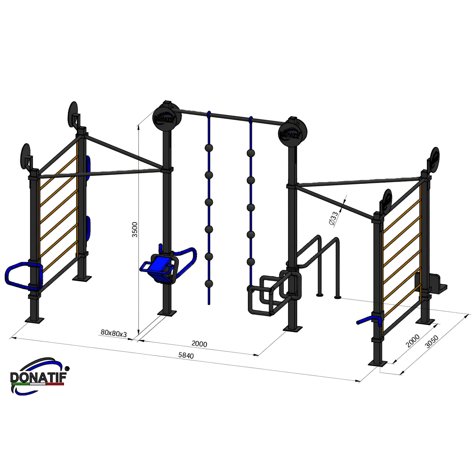 Indica las personalizaciones que deseas y haz clic en 'Guardar personalización'La Estructura de Barras de Doble Pared - CH65 DONATIF es una estación al aire libre diseñada para entrenamientos completos y multidisciplinarios. Fabricado en acero de alta resistencia con tubular cuadrado de 80x80x3 mm, combina solidez y durabilidad. El tratamiento de galvanizado en caliente y recubrimiento en polvo lo hace resistente a los agentes atmosféricos, preservando la funcionalidad y la estética incluso en espacios exteriores. Con unas dimensiones de 584 cm de profundidad, 305 cm de ancho y 350 cm de alto, y un peso total de 230 kg, ofrece estabilidad y fiabilidad. Entre sus elementos: espalderas verticales para escalada, estiramientos y movilidad, barras paralelas para inmersiones y entrenamiento de empuje, cuerdas con bolas de escalada para mejorar el agarre y la resistencia, barras de tracción (120 cm, diámetro 33 mm) para ejercicios de calistenia y entrenamiento funcional, así como módulos de apoyo para ejercicios dirigidos al core y miembros superiores.