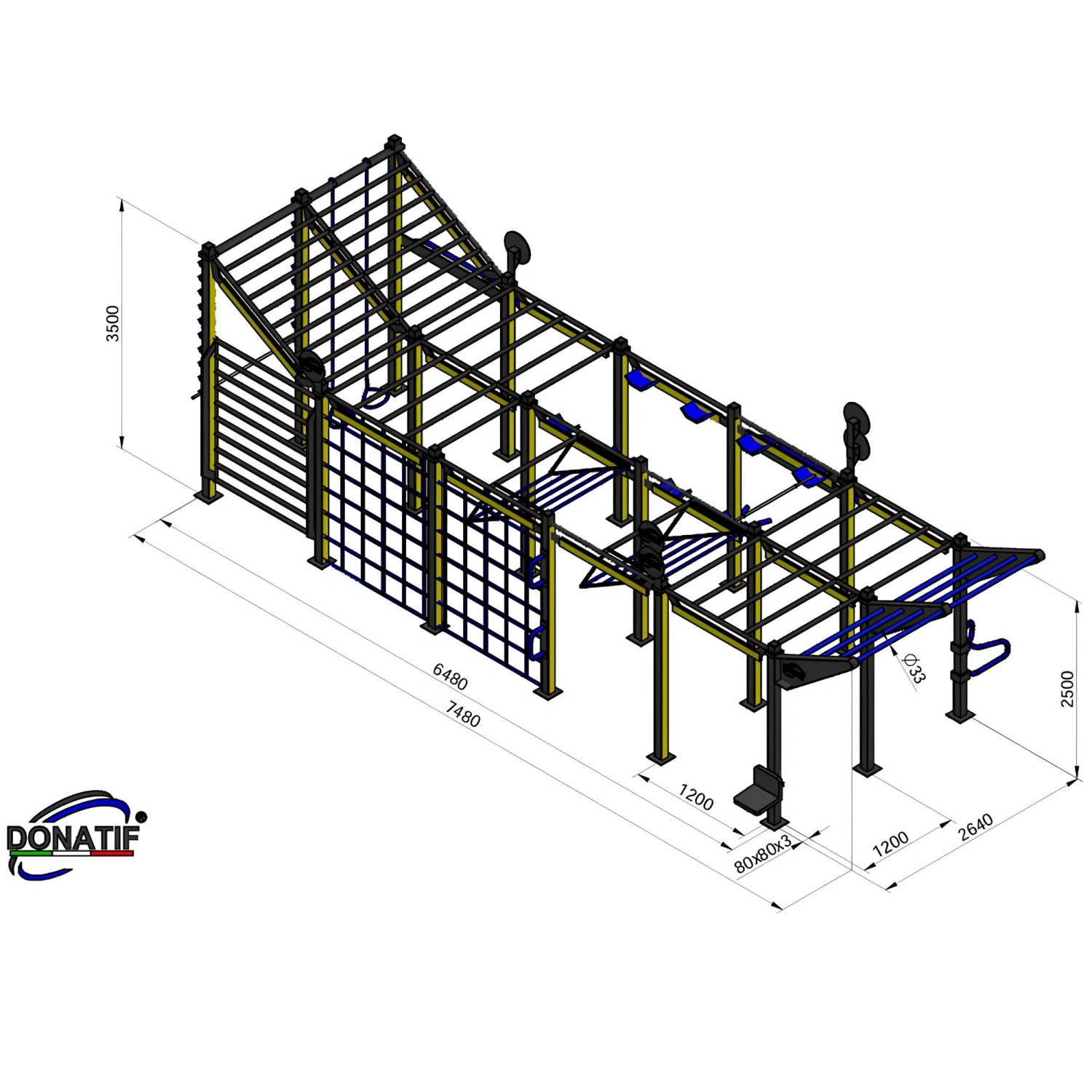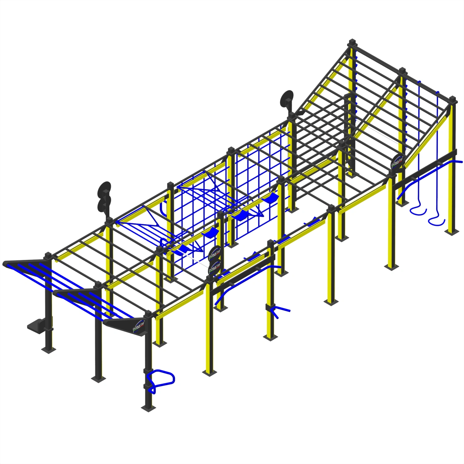 Esta estructura multifuncional está diseñada para ofrecer una experiencia de entrenamiento inmersiva, intensa y completa, ideal para entrenamientos tácticos, funcionales y OCR. Su desarrollo modular y continuo le permite abordar una variedad de obstáculos y estaciones que involucran a todo el cuerpo, estimulando la fuerza, la coordinación, la movilidad y la resistencia. Desde el principio, se enfrenta a barras horizontales que introducen una progresión técnica fluida, seguidas de una red suspendida y una jaula multipared, que requieren escalada, movimientos rápidos y control del cuerpo en suspensión. El recorrido continúa con tramos equipados con cuerdas, bucles y bucles móviles, ideales para el trabajo de equilibrio y agarre, hasta llegar a rejillas inclinadas en varios niveles que simulan obstáculos de estilo militar. Cada paso está diseñado para entrenar dinámicamente habilidades físicas clave en condiciones similares a las de una carrera u operación de campo.