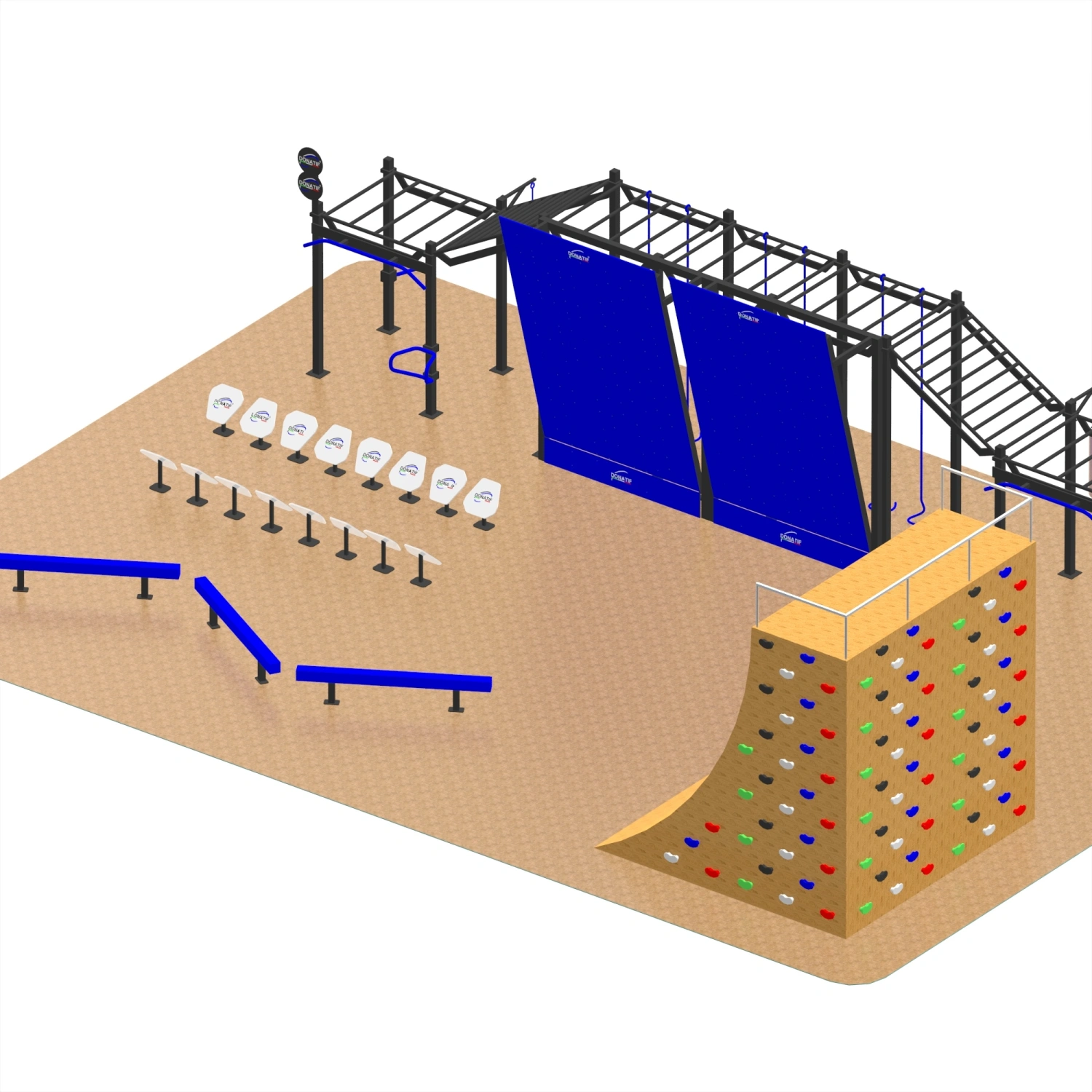 Esta estructura de calistenia con rampa - CH36 ofrece una amplia gama de posibilidades de entrenamiento, lo que la hace ideal para atletas, entusiastas del fitness y practicantes de calistenia. Se pueden realizar ejercicios como dominadas, muscle-ups y dominadas en las barras de dominadas, que son útiles para desarrollar la fuerza de la parte superior del cuerpo. Las barras de mono y las barras transversales permiten trabajar la coordinación, la resistencia y el agarre, que también son esenciales para quienes practican carreras de obstáculos. Las barras paralelas son perfectas para fondos, flexiones y planchas, mientras que los bancos multifuncionales permiten entrenamientos específicos en abdominales y estabilidad central. Las paredes inclinadas entrenan la potencia y la agilidad, la rampa de carrera de la pared estimula la velocidad, la fuerza explosiva y la capacidad de superar obstáculos, y el muro de escalada con presas coloridas fortalece la fuerza, el equilibrio y la movilidad. Finalmente, las vallas bajas y las vigas de equilibrio completan el recorrido con ejercicios dedicados a la estabilidad, la propiocepción y la precisión de los movimientos.