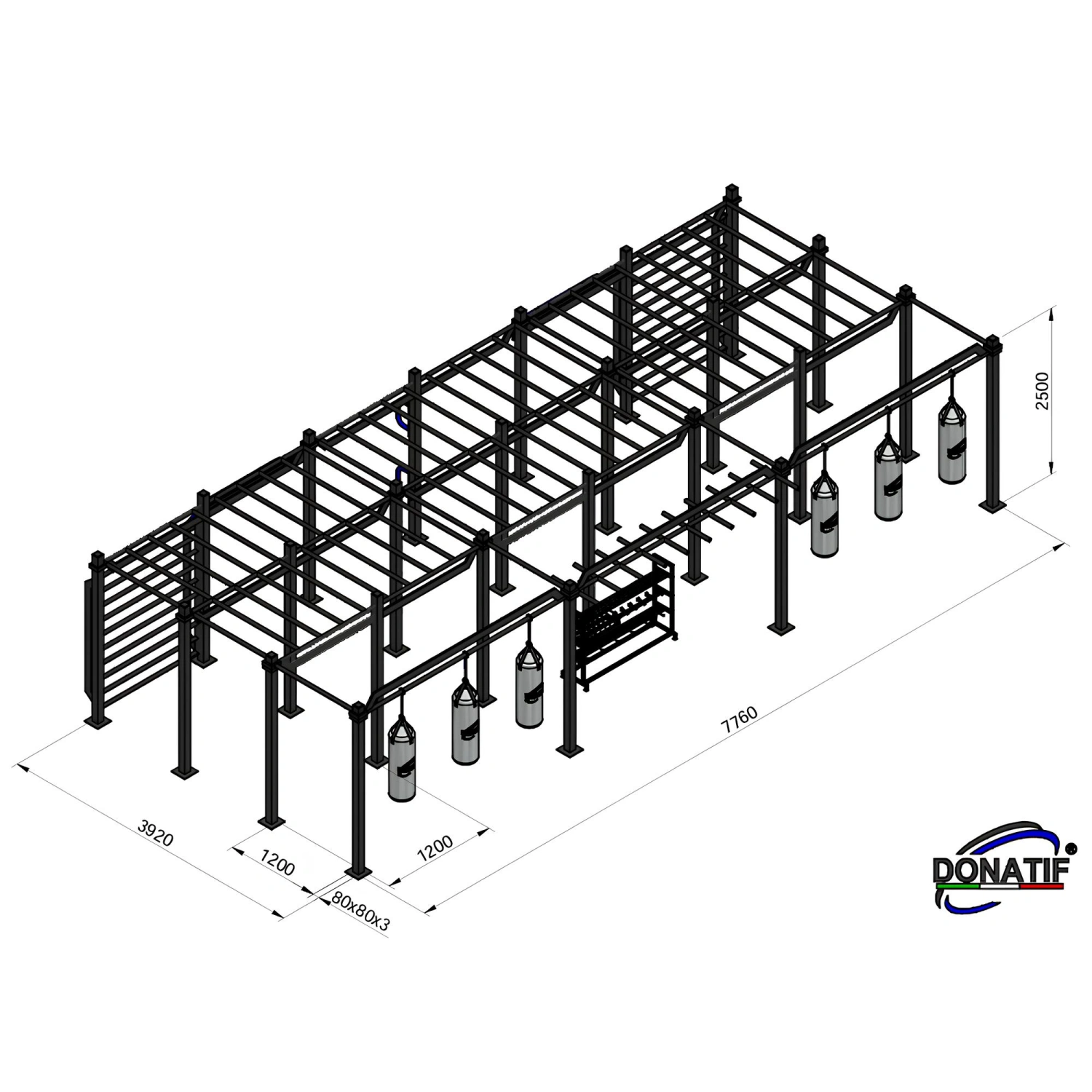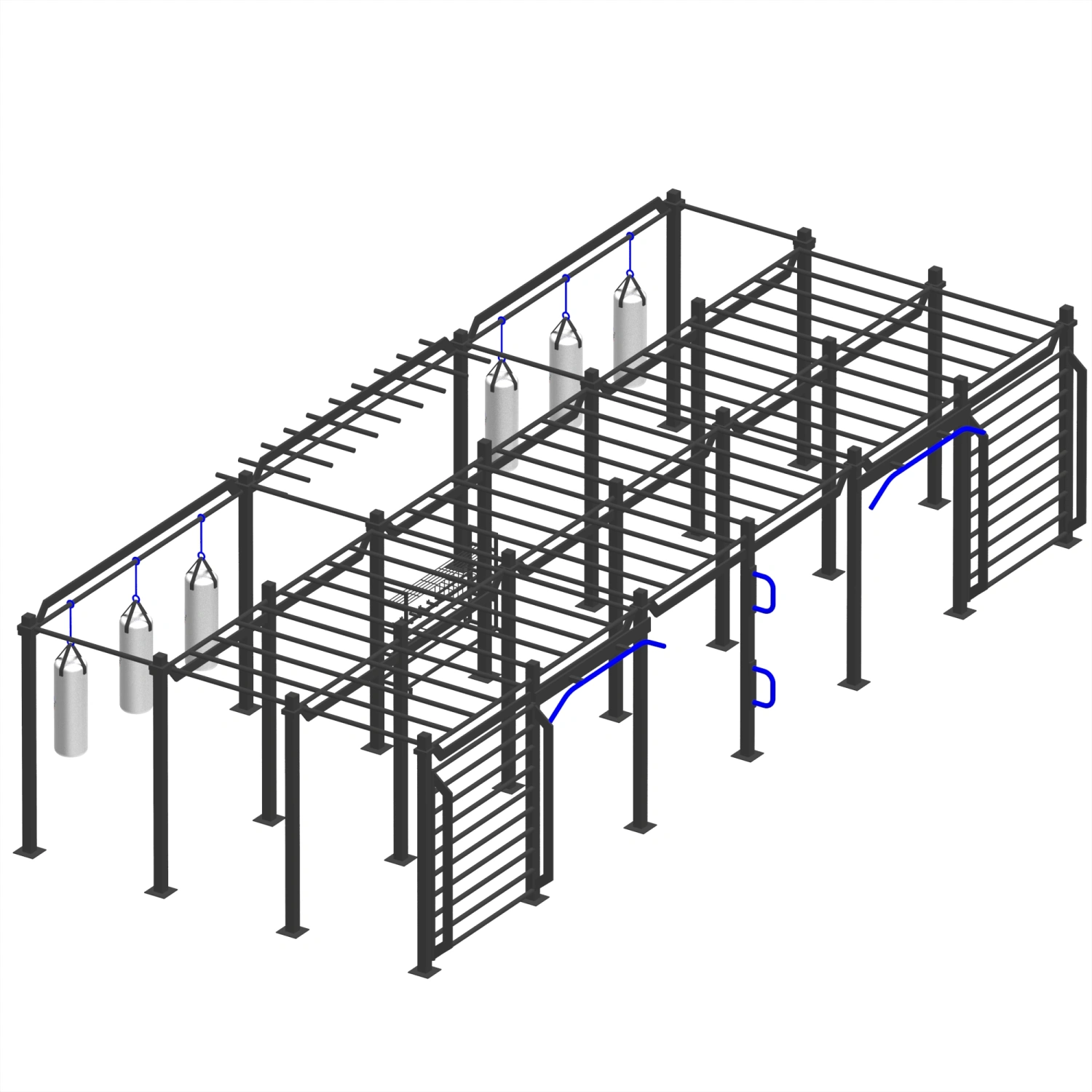 Esta estructura multifuncional está diseñada para combinar el entrenamiento funcional, el entrenamiento atlético y las disciplinas de combate en una sola estructura. Cuenta con un doble carril de barras de mono para ejercicios de suspensión y dominadas, así como varios sacos de boxeo colgantes para trabajos cardiovasculares y técnicos. A los lados hay escaleras verticales y peldaños como una escalera sueca para escalada y ejercicios de fuerza, mientras que las asas paralelas permiten inmersiones y movimientos de cuerpo libre. Un módulo de rejilla de herramientas está integrado en el centro para mantener el área ordenada y funcional. La estructura se completa con barras para múltiples dominadas, ideales para entrenamientos versátiles y grupales. Compacto, técnico y completo: perfecto para gimnasios y centros de alta intensidad.