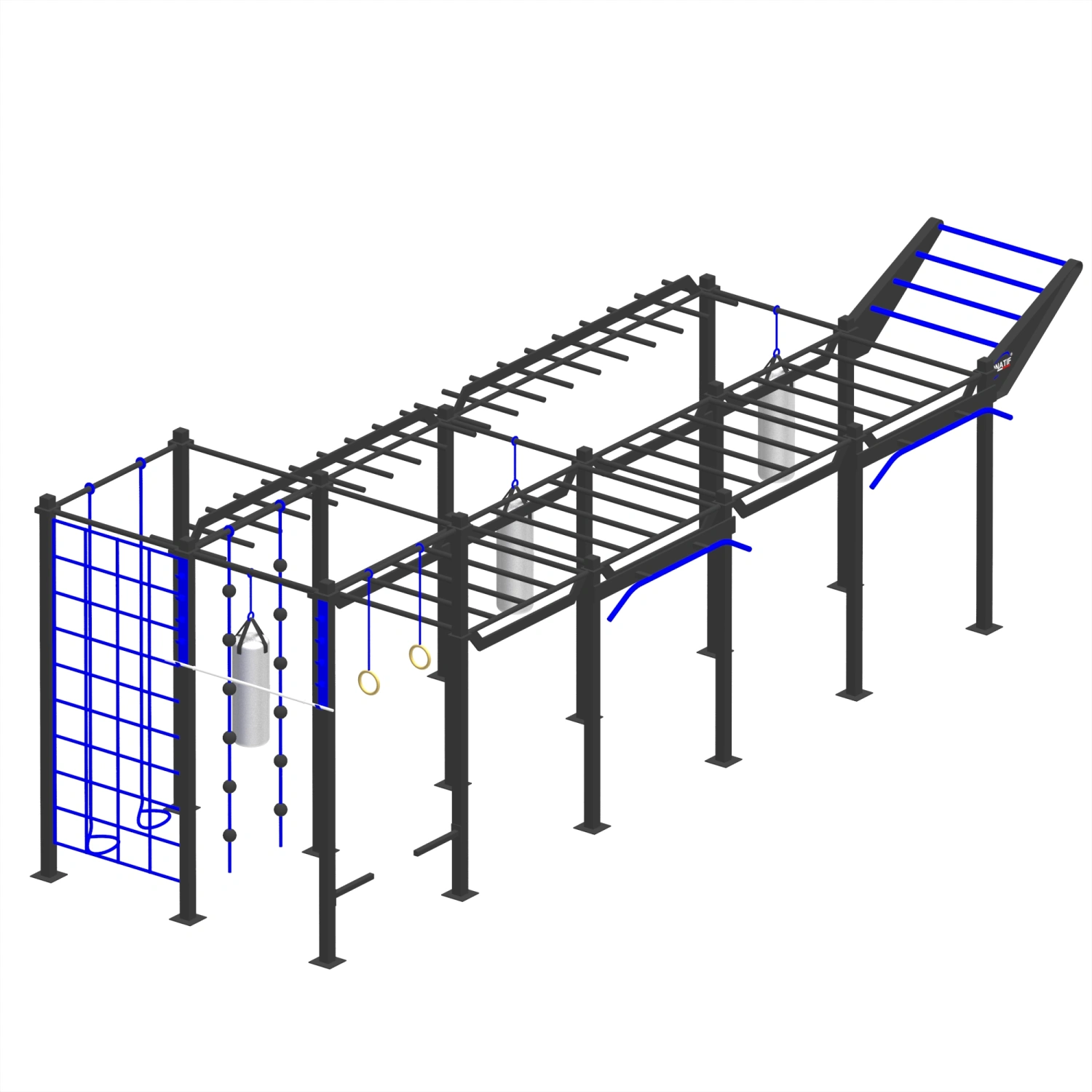 Esta estructura modular para entrenamiento funcional y cross representa una solución completa y versátil para entrenamientos de alta intensidad, ideal para gimnasios, centros OCR, boxes de crossfit y espacios exteriores. Fabricado con un sólido marco de acero pintado, integra una pared de rejilla vertical para ejercicios de escalada, una cuerda de escalada y bolas de agarre para mejorar la fuerza y el agarre, un saco de boxeo para golpear y anillos de gimnasia para dominadas y muscle-ups. En el centro, una larga serie de barras horizontales permiten el trabajo transversal y funcional en la parte superior del tronco, flanqueadas por ganchos para TRX o herramientas suspendidas. La sección final presenta una rampa inclinada con escalera de mono, perfecta para pruebas explosivas y despeje de obstáculos al estilo OCR. Las barras laterales y colgantes completan la estructura ofreciendo opciones adicionales para ejercicios de peso corporal en diferentes niveles. Robusta, compacta y multifuncional, esta estructura está diseñada para aquellos que buscan rendimiento, variedad y desafío en una sola herramienta profesional.