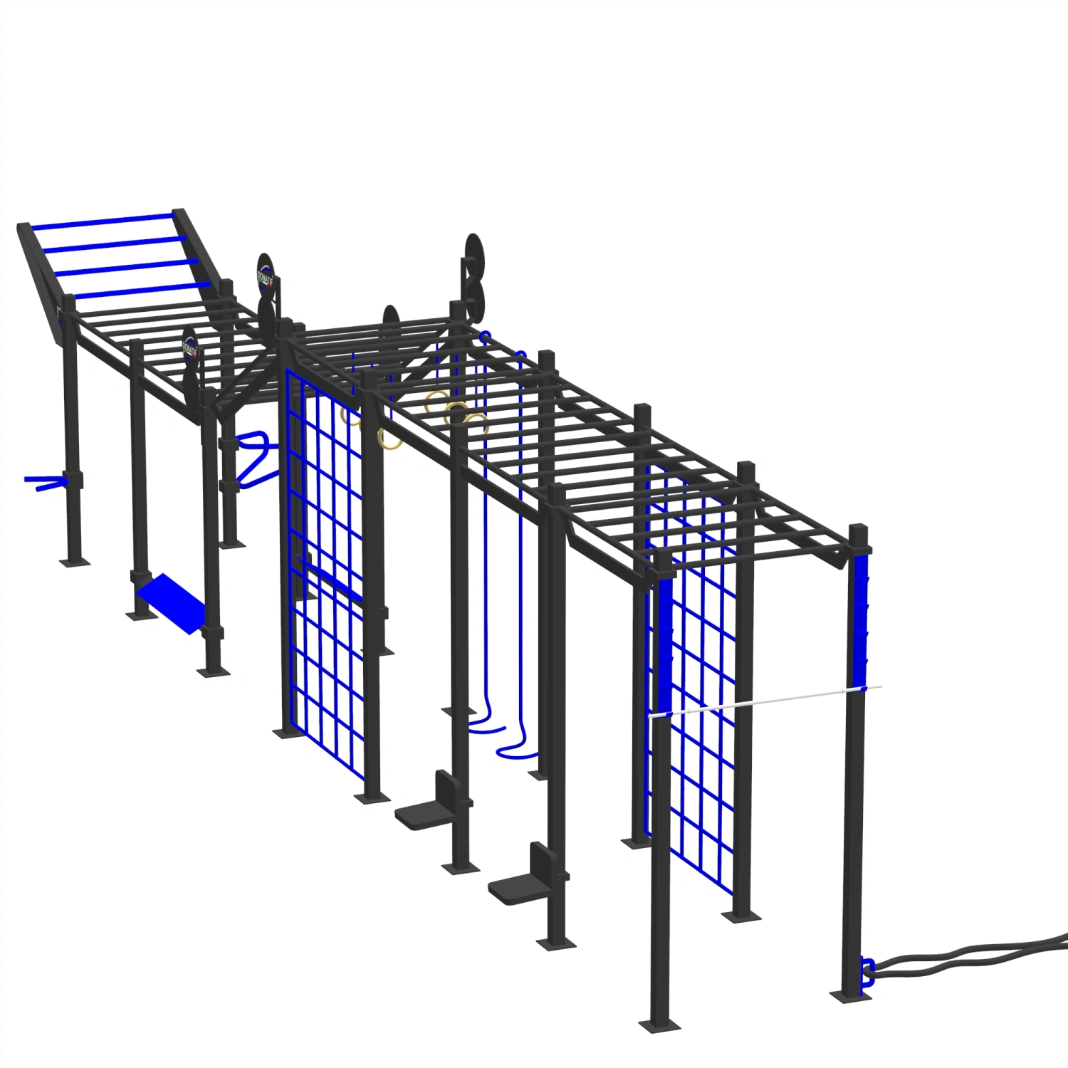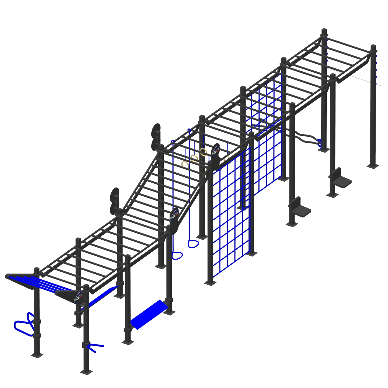 La estructura incluye Monkey Bars horizontales e inclinadas para ejercicios de tracción y movilidad, espalderas verticales y una red vertical (escalador de pared) para entrenar la coordinación, la fuerza y la agilidad a través de la escalada, anillas de gimnasia y cuerdas con asas suspendidas para el fortalecimiento de la parte superior del cuerpo y el agarre. También hay barras de dominadas ideales para dominadas y muscle-ups, estaciones paralelas para fondos dirigidos al pecho, hombros y tríceps, clavijas verticales (clavijeros) para escalada avanzada, objetivos verticales (objetivos) para ejercicios pliométricos y plataformas de apoyo laterales para entrenamientos funcionales de las extremidades inferiores. En general, esta composición ofrece una amplia gama de posibilidades para entrenar la fuerza, la agilidad, el equilibrio y la resistencia.