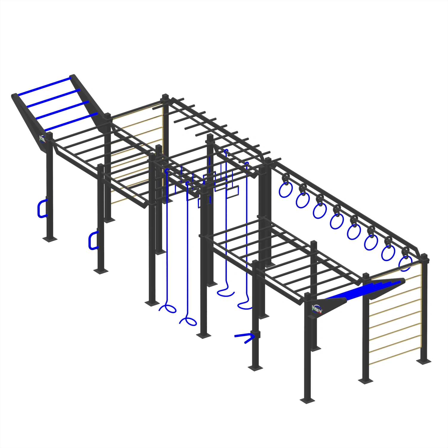 Esta instalación es la solución ideal para el entrenamiento funcional, el OCR y las preparaciones atléticas de alto nivel. Reúne una amplia gama de herramientas en una sola instalación: rampas oblicuas para ascensos dinámicos, paredes con peldaños de escalada, barras de mono horizontales e inclinadas, anillas suspendidas, cuerdas verticales y presas técnicas OCR como balas de cañón, barras móviles y estribos. La estructura se completa con barras de dominadas, ideales para ejercicios de peso corporal y circuitos funcionales. Compacto, completo y altamente entrenador: perfecto para gimnasios, centros OCR y áreas de formación profesional.